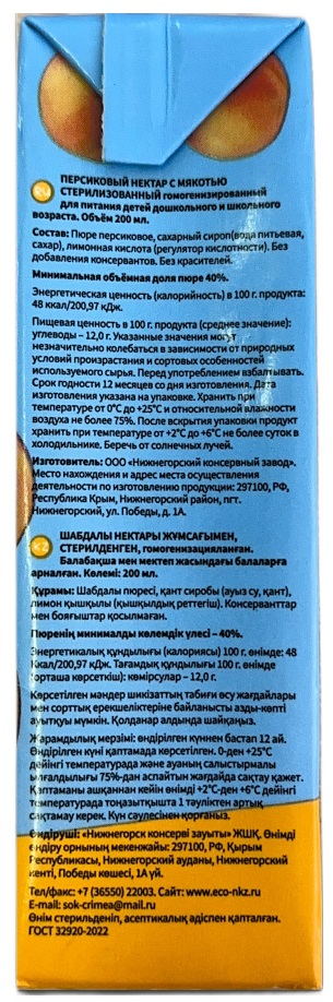 Персиковый нектар из спелых сочных крымских персиков. Обладает нежным вкусом и ароматом спелых персиков. Наличие мякоти придает напитку густую, бархатистую текстуру и повышает содержание пищевых волокон.
