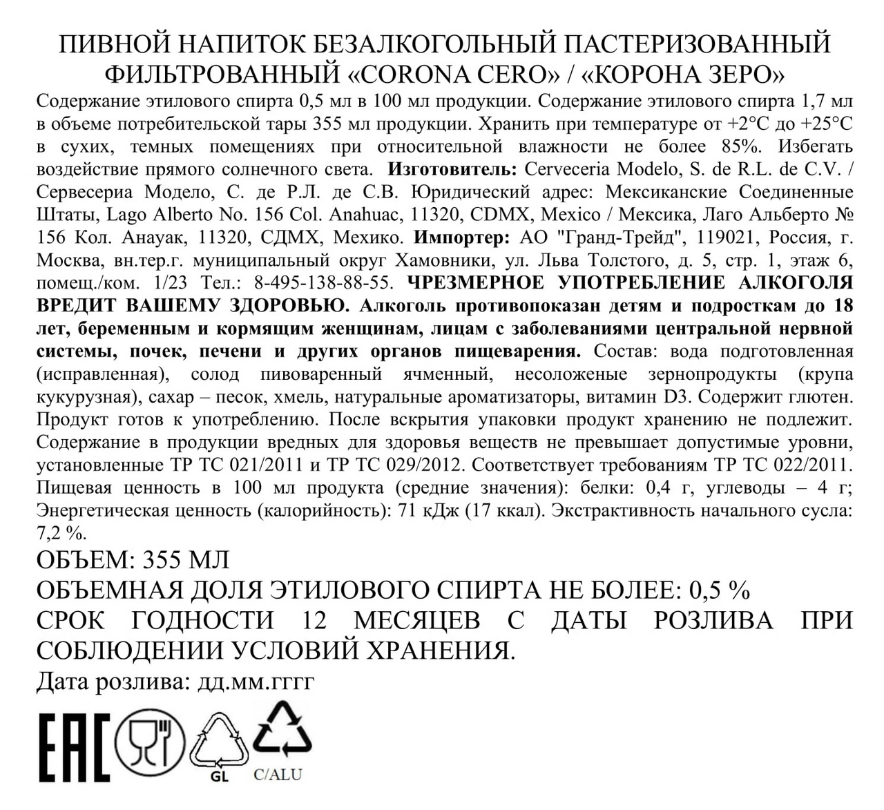 Напиток пивной Corona Cero безалкогольный, 0.355л