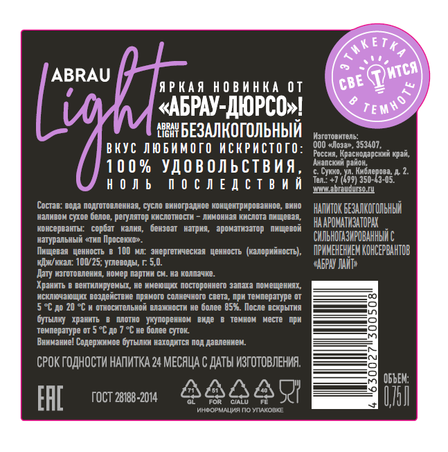 Напиток винный безалкогольный Абрау Дюрсо Лайт газированный, 0.75л – новинка компании Абрау-Дюрсо, которая станет отличной альтернативой для тех, кто за рулем, кто соблюдает определенный режим или по каким-либо причинам не может употреблять алкоголь. Яркий напиток помогает утолить жажду в знойные летние дни и получить заряд бодрости после интенсивных физических нагрузок. Он отличается выразительным ароматом, в котором сплелись ягодные, минеральные, цитрусовые акценты. Округлый, хорошо сбалансированный вкус вина раскрывается клубничными, цитрусовыми и малиновыми аккордами в сопровождении солоноватых минеральных полутонов, а затем плавно переходит в продолжительное приятное послевкусие. Вкусовые и ароматические качества благородного напитка лучше всего раскрываются в охлажденном виде: при температуре около 8-10 С. Его предлагают в качестве аперитива, а также в сопровождении с различными кулинарными блюдами. Напиток составит удачное сочетание с фруктами, десертами, мороженым, бисквитом, ягодным пирогом. Перед подачей безалкогольный напиток лучше всего охладить.