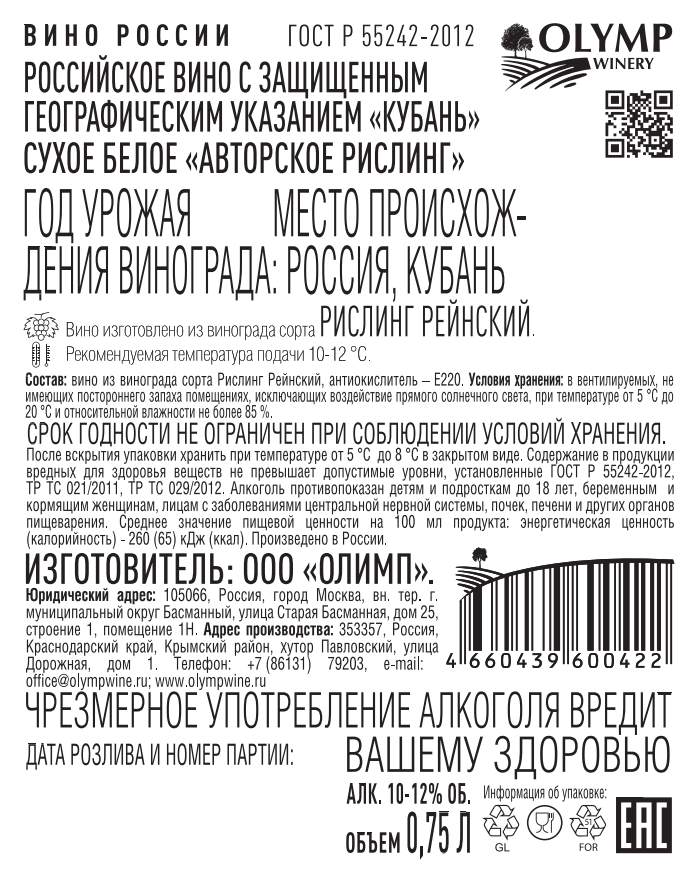 Авторский Рислинг - гармоничное сухое белое вино. Частичная выдержка во французских барриках. Глубокий темно-рубиновый цвет. Насыщенный аромат с тонами спелых темных ягод, вишневого компота и пряных специй, плотный вкус с хорошо интегрированными танинами и стойким послевкусием. Рекомендуется подавать к мясным блюдам с насыщенным вкусом, стейкам, баранине, дичи, а также блюдам с трюфелями и выдержанным сырам. Перед подачей рекомендуется декантировать.
