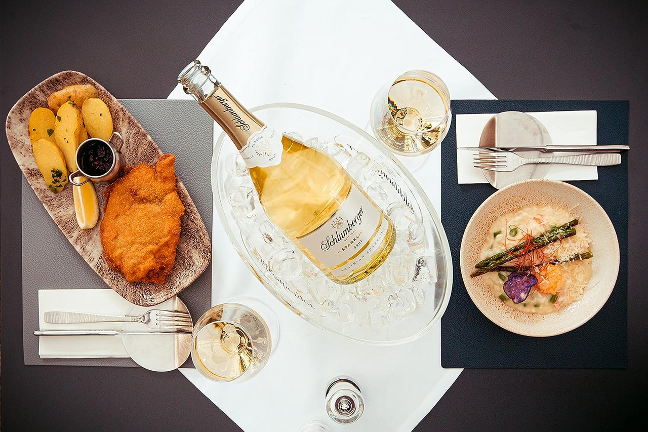 Элегантное белое игристое вино Schlumberger, Sparkling Brut Klassik производится с использованием "Methode Traditionelle" (метода традиционной шампанизации) только из выращенного в Австрии винограда сортов Вельшрислинг, Шардоне и Пино Блан. Согласно технологии, подготовленная смесь, состоящая из кюве, тиражного ликера и культуры винных дрожжей, разливается в бутылки и выдерживается в специально оборудован��ых подземных погребах не менее 18 месяцев при постоянной влажности и температуре около 15-16 C. После удаления дрожжевого осадка (дегоржажа) в продукт вводится экспедиционный ликер, содержащий сахар. Вид будущего игристого вина зависит от количества добавленного ликера. В Брюте содержится минимальное количество сахара. Schlumberger — старейший австрийский производитель игристых вин. В 1842 году компанию основал выходец из Голдека Роберт Альвин Шлюмбергер. До момента создания винного дома он работал в Реймсе (Франция) в известных погребах Ruinart Pere et Fils, специализировавшихся на изготовлении игристых вин, и стал хорошим мастером купажа. Вернувшись на родину, Шлюмбергер организовал в Феслау аналогичное производство в соответствии с классическими методами шампанизации. Уже в 1845 году вина Schlumberger были отмечены наградой на Австрийской Торговой Выставке. В последующие десятилетия компания расширяется и на рубеже веков начинает поставлять свою продукцию австрийскому королевскому двору. После Второй Мировой Войны винный дом Schlumberger выходит на новый уровень развития и с 1973 года является составной частью семейной корпорации Underberg. В настоящее время, несмотря на то, что владельцы компании периодически менялись, дом игристых вин Schlumberger как и прежде придерживается традиций, заложенных Робертом Шлюмбергером 170 лет назад. Вино производится из традиционных сортов винограда — Шардоне, Пино Нуар, Рислинг и Пино Блан, выращенных в австрийских виноградниках, и выдерживается в знаменитых погребах Schlumberger, ставших достопримечательностью и популярным местом, посещаемым туристами.
