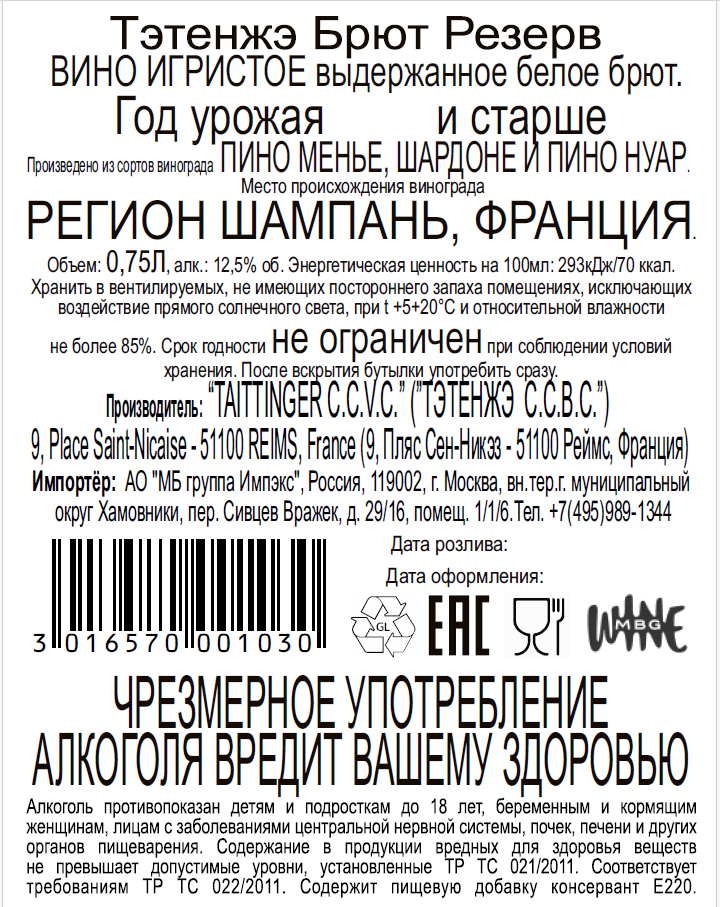 Вино игристое Шампань Taittinger Reserve белое брют, 0.75л
