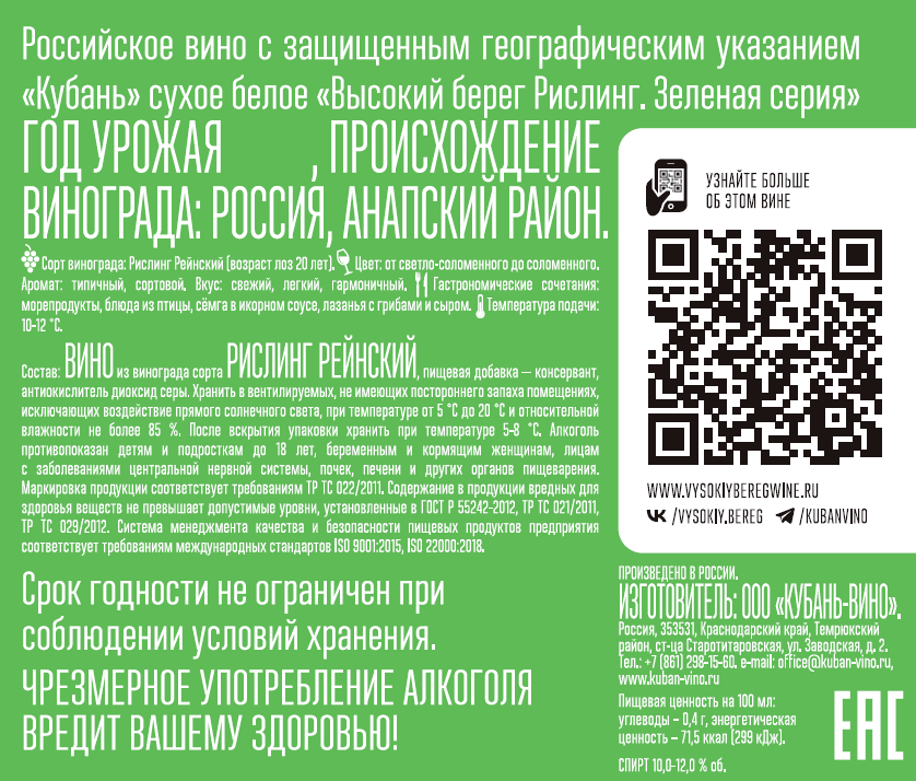 Вино Высокий Берег рислинг белое сухое, 0.75л