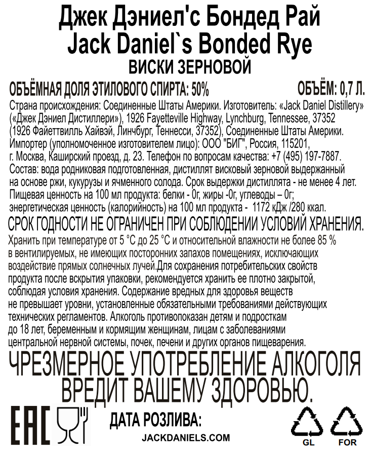 Виски Jack Daniel's Bonded Rye зерновой, 0.7