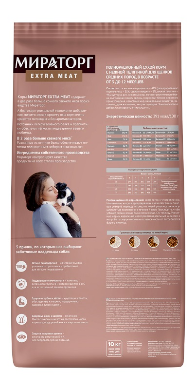 Корм премиум класса со свежей говядиной и телятиной собственного производства, создан для питомцев, привередливых в выборе питания, а также имеющих чувствительное пищеварение. Диетическая телятина и легко усвояемая говядина дополняют корм полноценным белком животного происхождения для особой пользы и изысканного вкуса. Щенки средних пород взрослеют к 12 месяцам, поэтому их рацион должен быть питательным и полезным. В корме extra meat высокое содержание белка из отборного свежего мяса. Сбалансированный витамино-минеральный комплекс обеспечивает правильное формирование опорно-двигательного аппарата. Натуральные пребиотики способствуют поддержанию иммунитета и обеспечивают комфортное пищеварение. Корм готов к употреблению. Напоминаем, что для предотвращения нежелательных пищевых реакций, перевод питомца на новый рацион должен осуществляться постепенно, в течение 7 дней.
