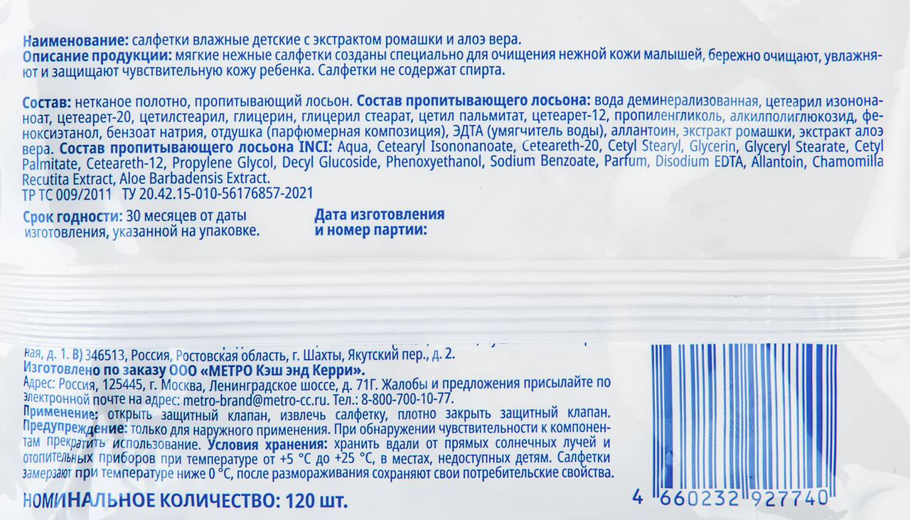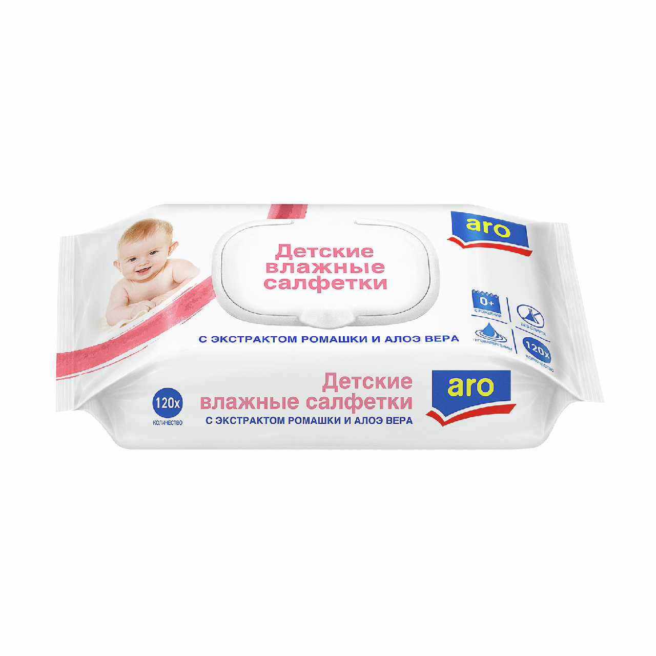 aro Салфетки влажные детские ромашка-алоэ вера, 120шт - влажные детские салфетки, созданы специально для очищения нежной кожи малышей, бережно очищают, увлажняют и защищают чувствительную кожу ребенка. Натуральный состав лосьона питает и увлажняет кожу, а экстракты ромашки и алоэ обладают антисептическим и успокаивающим действием, позволяют поддерживать необходимый баланс кожи, что так важно и ценно для каждой заботящейся мамы. Одноразовые влажные салфетки изготовлены из высококачественных материалов, не содержат спирта, парабенов и отдушек, имеют легкий приятный аромат и совершенно безопасны для детей. Использование влажных салфеток упрощает уход за малышом в домашних условиях и является необходимым элементом в поездках, в гостях, в торговых центрах, на прогулках. Растительные экстракты ромашки и алое вера увлажняют и смягчает нежную кожу младенца, предотвращает образование шелушений, оказывают противовоспалительное действие. Липкий клапан надежно закрывает упаковку с детскими салфетками и предотвращает их преждевременное высыхание.