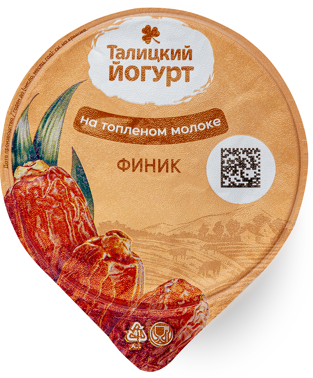 Йогурт на топленом молоке Талицкий Финик. В составе продукта есть финик, который также способствует нормальной и регулярной работе пищеварительной системы. Йогурт может быть отличным завтраком или вариантом полезного перекуса в течение дня.