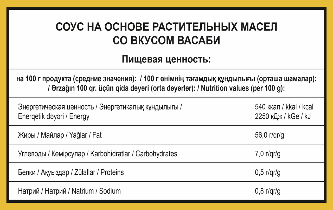 Масло подсолнечное рафинированное дезодорированное, вода, сахар, продукты яичные, соль, загустители (Е1422, Е440), регулятор кислотности (Е270, Е260), ароматизатор "Горчица" (содержит сою), краситель Е141, экстракт зеленого чая, ароматизатор натуральный "Вкус васаби" (содержит горчицу), консерванты (Е211, Е202), антиокислитель Е385.