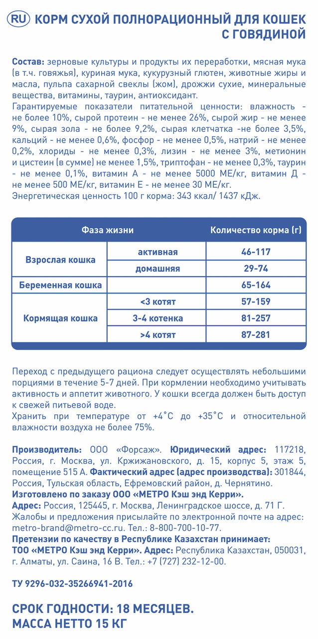 Сбалансированный рацион питания для пушистого любимца. Корм изготовленный на основе говядины быстро утоляет аппетит питомца, дарит ему заряд бодрости и наполняет его силами. При его изготовлении учитываются необходимые для животных пропорции питательных веществ, поэтому продукт легко усваивается и не создает излишней нагрузки на пищеварительную систему и почки. Корм не содержит химических красителей и ароматизаторов. Он отличается приятным для кошек вкусом и ароматом и подходит для взрослых животных любой породы. Суточная норма питания зависит от веса пушистого друга. Ее можно рассчитать с помощью специальной таблицы, которая представлена на обратной стороне упаковки. Весь суточный объем корма рекомендуется сразу насыпать в миску. Коты сами устанавливают количество приемов пищи. Рядом с кормом необходимо оставлять емкость с чистой, питьевой водой.