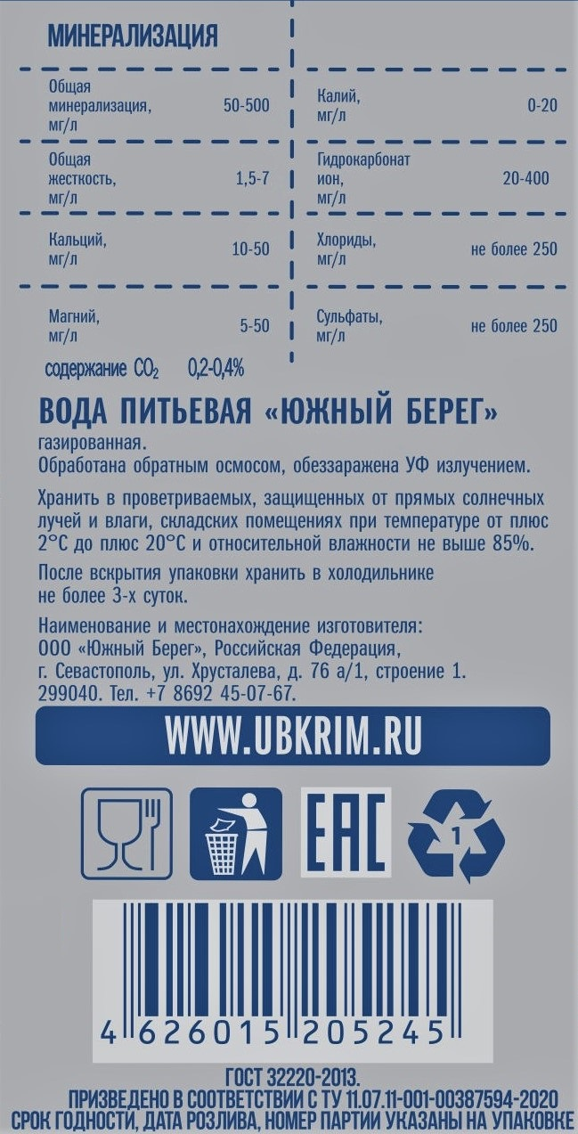 Вода Южный берег питьевая газированная, 1.5л обработана обратным осмосом, обеззаражена Уф излучением. Уникальная по своему происхождению и составу. На заводе вода проходит очистку на лучшем немецком оборудовании. Рекомендована к употреблению и взрослым, и детям. Поддержание водного баланса - простой способ заботы о своём здоровье.