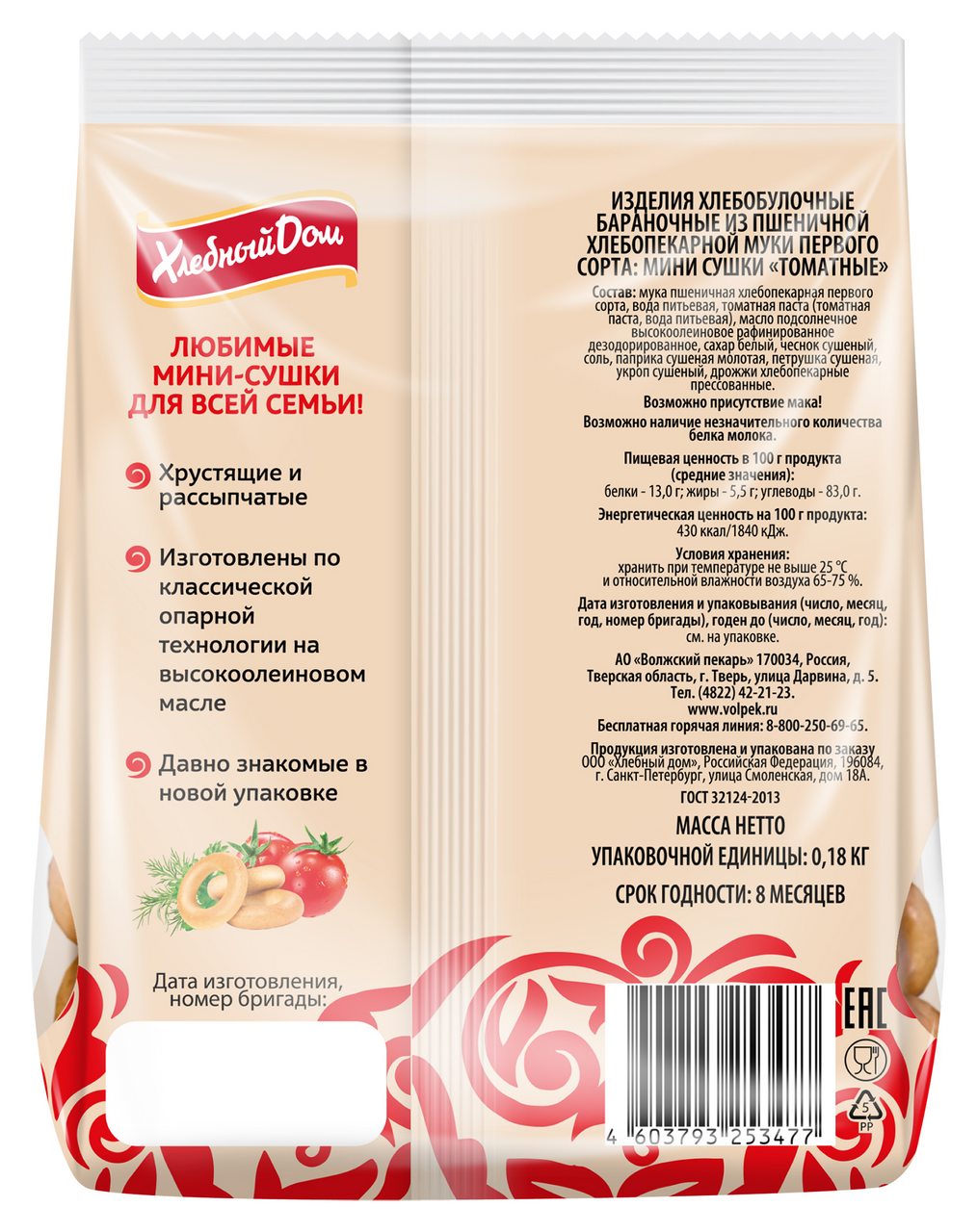 Мини-сушка Хлебный дом Томатная – этоаппетитные хрустящие снековые мини-сушки из муки пшеничной 1 сорта со вкусом томатов и добавлением натуральной зелени. Кулинарный продукт идеально подойдет для быстрого перекуса как дома, так и на работе либо в поездке.