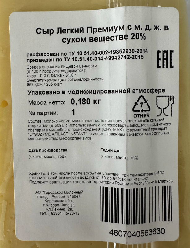 Молоко нормализированное, соль пищевая, уплотнитель - кальций хлористый (Е509), с ипользованием молокосвертывающего ферментного препарата ферментативного происхождения, ферментный препарат лизоцим, с использованием закваски мезофильных молочнокислых микроорганизмов, биоконсерванет с действующим веществом натамицин.
