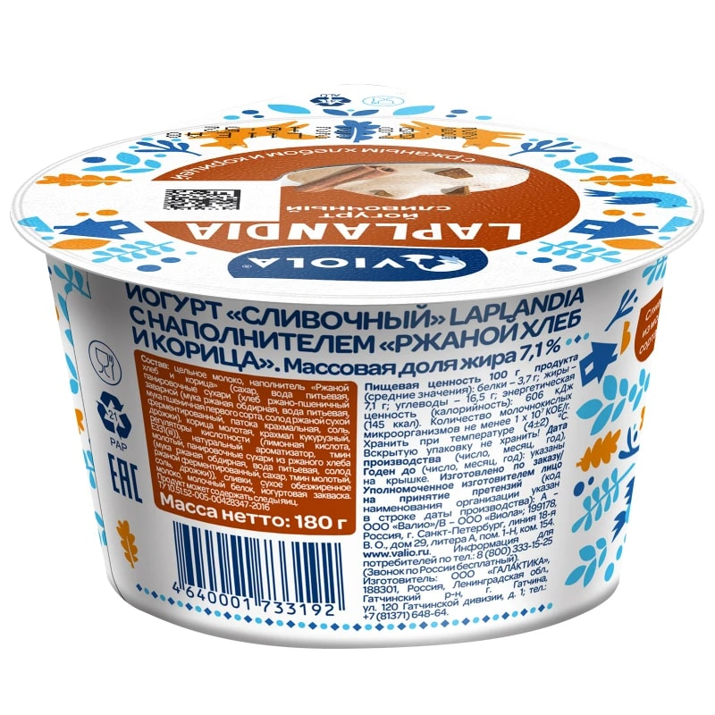 Йогурт Viola Laplandia с ржаным хлебом и корицей сливочный 7.1%, 180г