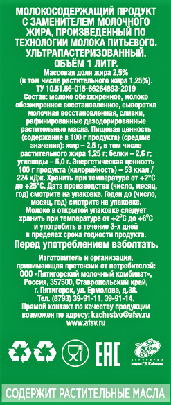 Продукт молокосодержащий Эконом ультрапастеризованный 2.5%, 1л является высокопитательным продуктом, который подходят для всей семьи. Напиток содержит витаминно-минеральный комплекс и богат кальцием, магнием, калием, витамины А, В и D и другими полезными микрокомпонентами. При регулярном употреблении напиток помогает укрепить иммунитет и улучшить работу желудочно-кишечного тракта. Такой продукт активно используется хозяйками при создании разнообразных блюд. Напиток выступает основой при приготовлении простокваши, ряженки, творога, а также мороженого и теста. Без него не обходятся вкусные и полезные каши, гранола и мюсли. Употреблять напиток допускается как в чистом виде, так и добавлять в крепкий черный чай, кофе и делать из него воздушные молочные коктейли. За счет ультрапастеризации продукт обладает длительным сроком хранения, а после вскрытия тары годен в течение трех суток.