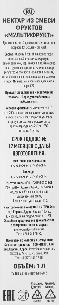 Мультифруктовый нектар обладает мягким и сбалансированным вкусом. Произведен из спелых и сочных фруктов, богатых витаминами и минеральными веществами. Содержит витамин С, который при ежедневном употреблении помогает снизить риск появления вирусных заболеваний, повышая иммунитет, а также провитамин А и антиоксиданты.