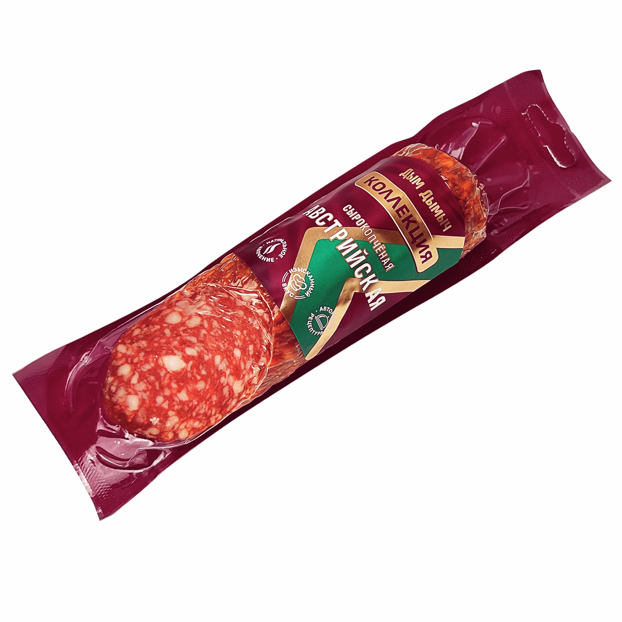 Классическая мелкозернистая колбаса - для любителей классики и умеренно пряного вкуса. Батон со срезом демонстрирует покупателю привлекательный пестрый рисунок сразу при покупке. Приготовлена по старинному австрийскому рецепту, а копчение на натуральной буковой щепе придает ей мягкий аромат дымка. Подойдет в виде мясной нарезки к праздничному столу, а также отлично будет смотреться на повседневных бутербродах и как закуска.