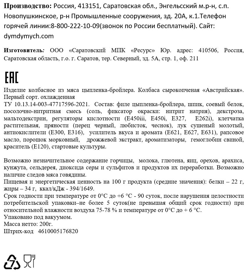 Колбаса Дым Дымыч Австрийская из мяса цыпленка-бройлера сырокопченая, 200г