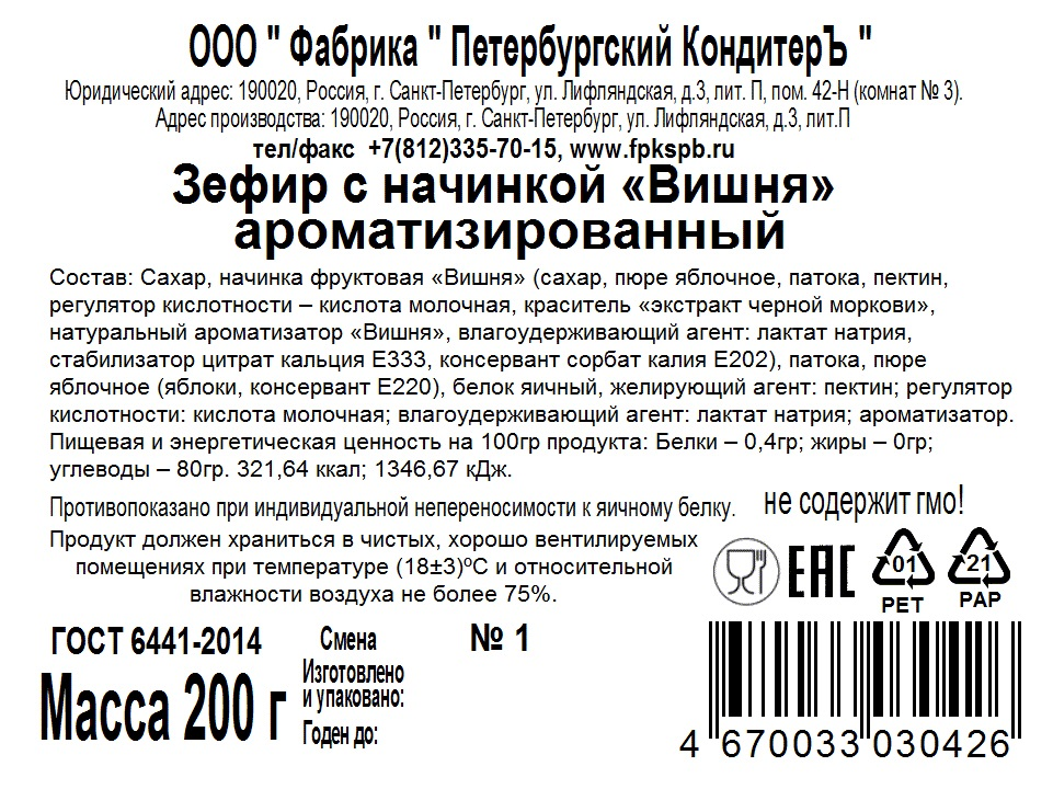 Зефир Петербургский кондитеръ с начинкой Вишня, 200г