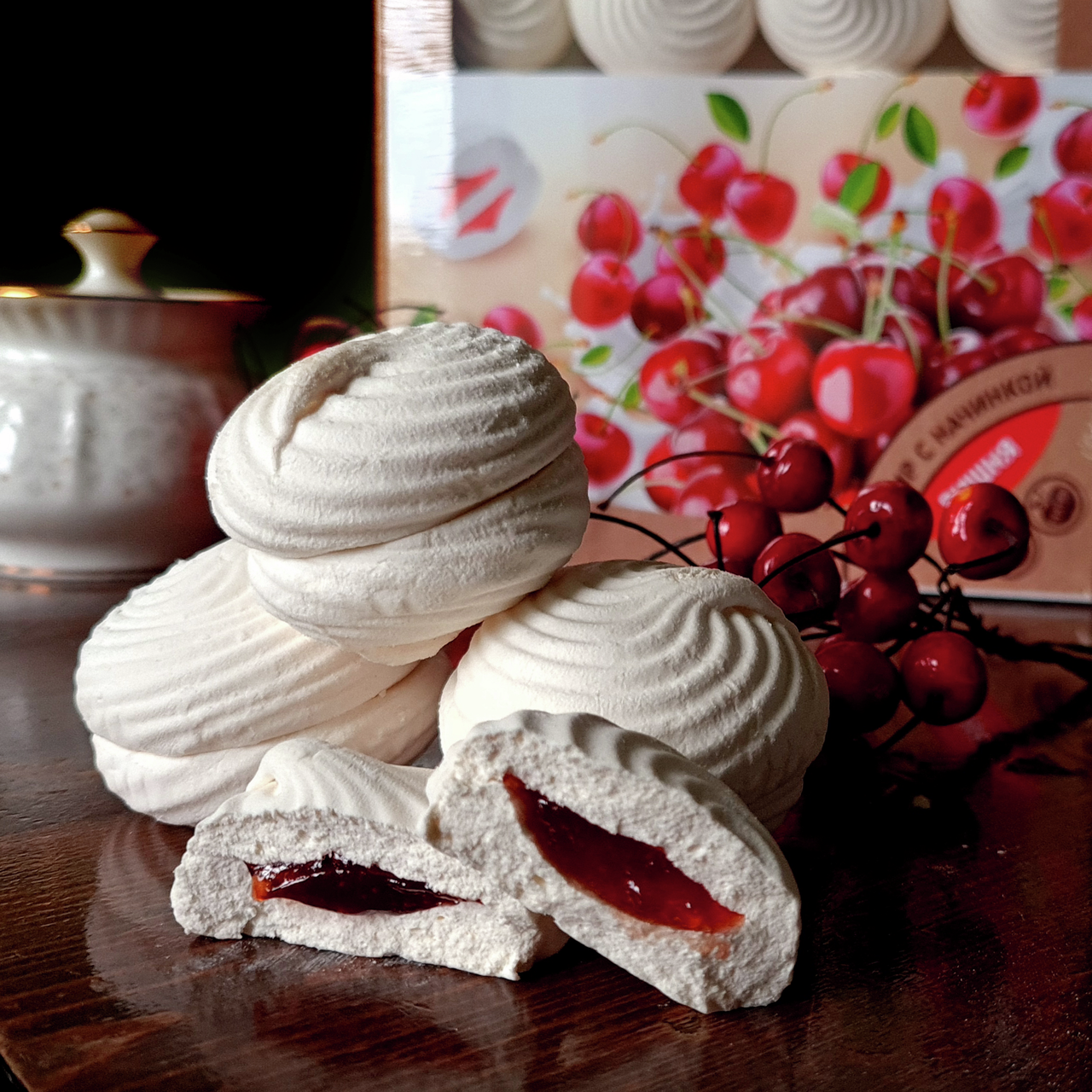 Зефир с сочной ароматной начинкой - особенно изысканное лакомство. Нежная текстура классического зефира идеально дополняется ароматной вишневой начинкой, создавая максимум удовольствия!