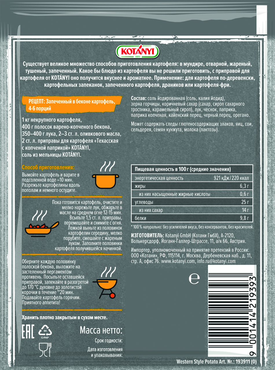 Соль йодированная (соль, калия йодид), зерна горчицы, коричневый сахар (сахар, тростниковый сахар, карамельный сироп), лук, чеснок, паприка, паприка копченая, кайенский перец, черный перец, орегано.