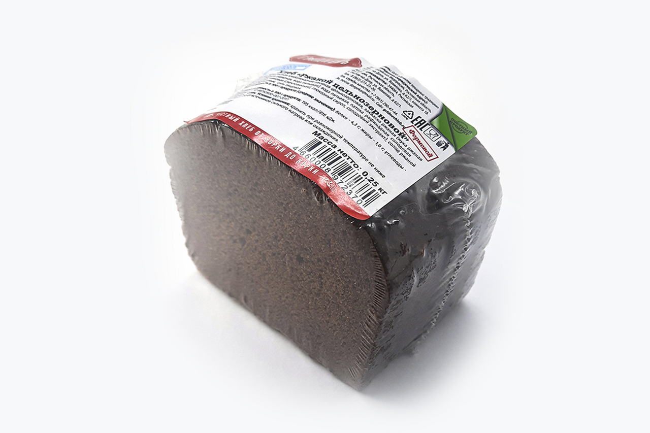 Хлеб из цельнозерновой ржаной муки грубого помола. Замешивается на ржаной закваске без добавления дрожжей. Разделывается вручную. Постный продукт. Без добавления сахара.