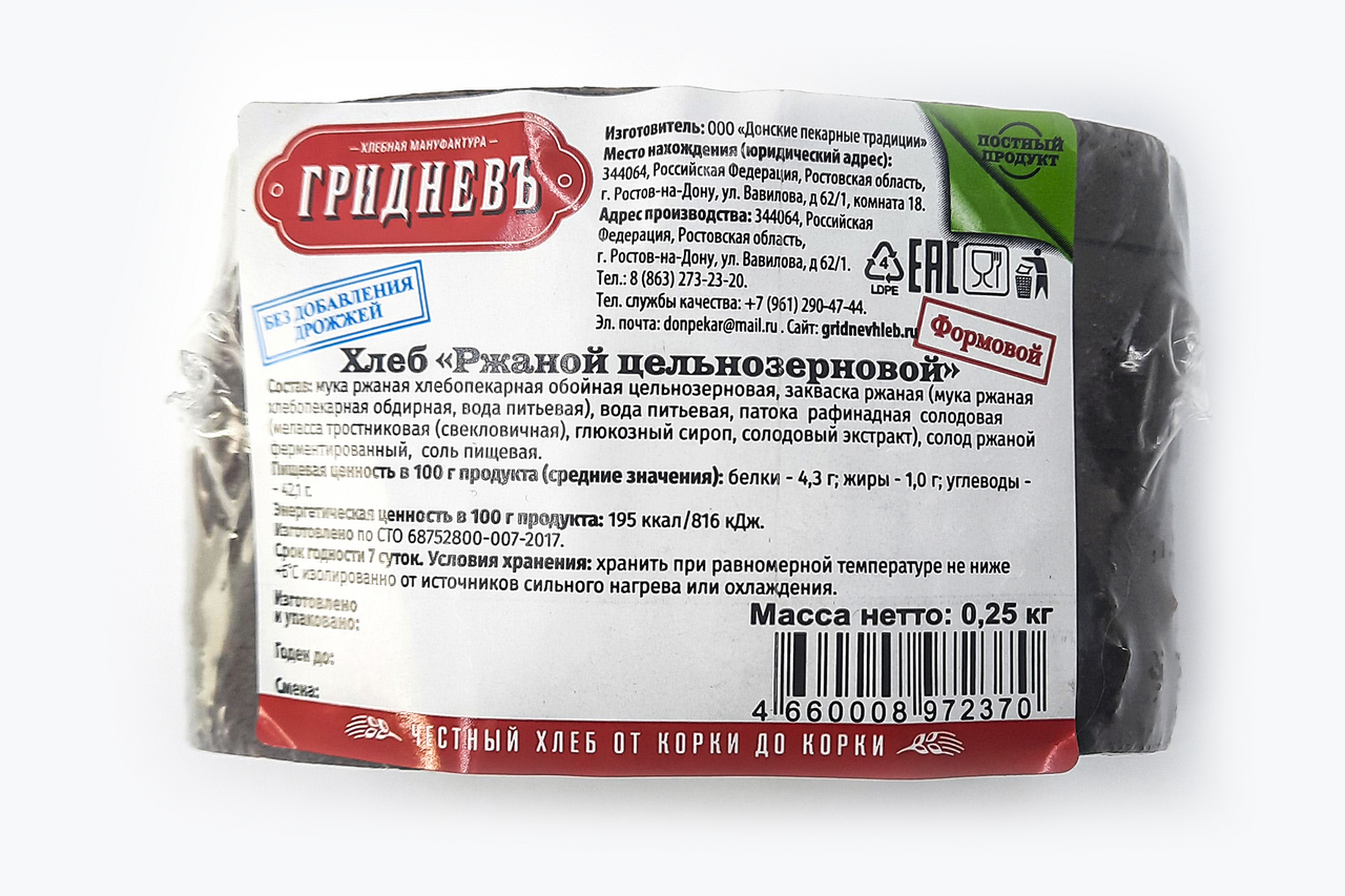 Хлеб Гридневъ ржаной цельнозерновой био, 250г