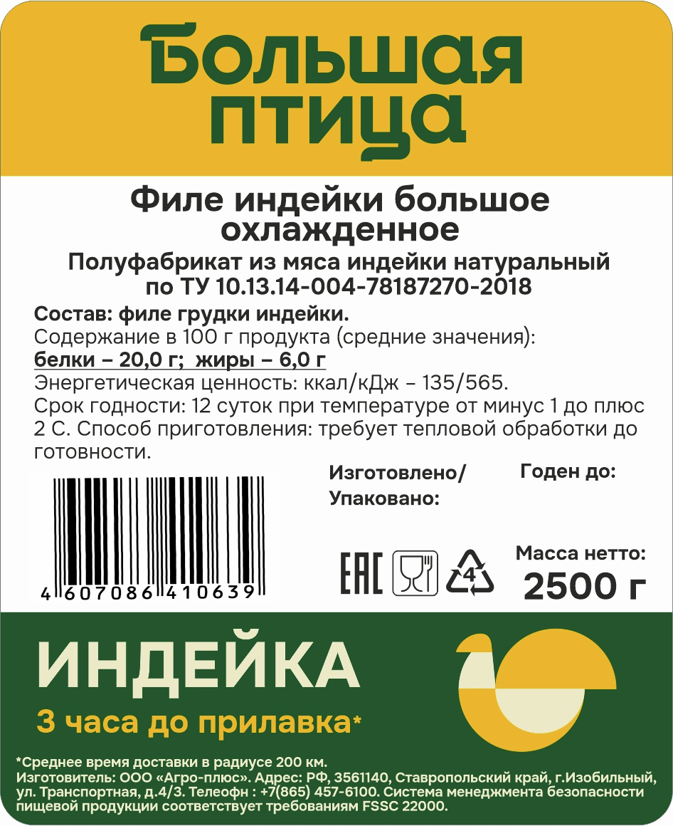 Филе индейки Большая птица большое охлажденное, ~2.5кг