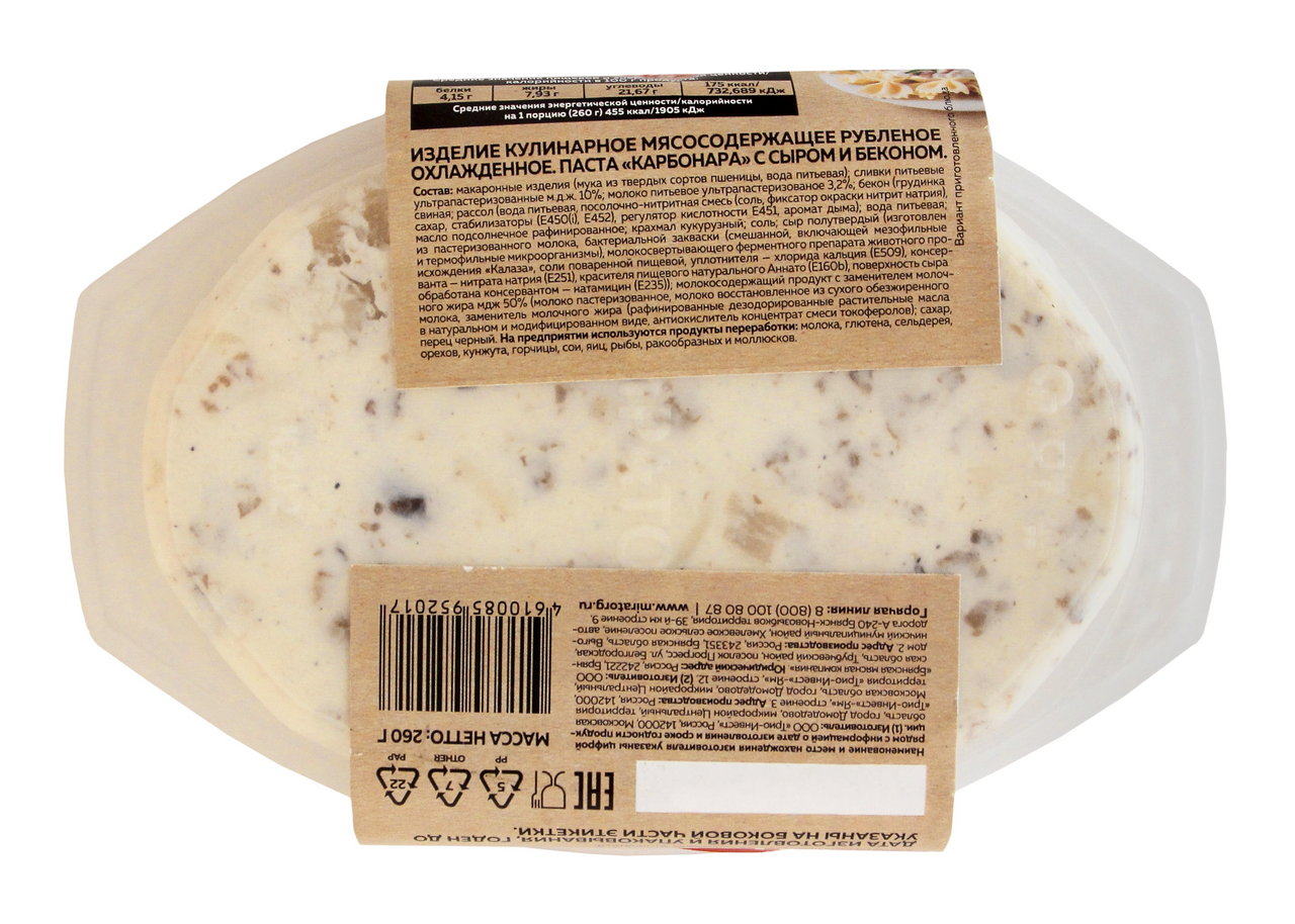 Макаронные изделия мука из твердых сортов пшеницы, вода питьевая; сливки питьевые ультрапастеризованные м. д. ж. 10% ; молоко питьевое ультрапастеризованое 3,2% ; бекон грудинка свиная; рассол вода питьевая, посолочно-нитритная смесь соль, фиксатор окраски нитрит натрия, сахар, стабилизаторы Е450i, Е452, регулятор кислотности Е451, аромат дыма; вода питьевая; масло подсолнечное рафинированное; крахмал кукурузный; соль; сыр полутвердый изготовлен из пастеризованного молока, бактериальной закваски смешанной, включающей мезофильные и термофильные микроорганизмы, молокосвертывающего ферментного препарата животного про- исхождения Калаза, соли поваренной пищевой, уплотнителя — хлорида кальция Е509, консер- ванта — нитрата натрия E251, красителя пищевого натурального Аннато Е160b, поверхность сыра обработана консервантом — натамицин Е235; молокосодержащий продукт с заменителем молочного жира мдж 50% молоко пастеризованное, молоко восстановленное из сухого обезжиренного молока, заменитель молочного жира рафинированные дезодорированные растительные масла в натуральном и модифицированном виде, антиокислитель концентрат смеси токоферолов; сахар, перец черный. На предприятии используются продукты переработки: молока, глютена, сельдерея, орехов, кунжута, горчицы, яиц, рыбы, ракообразных и моллюсков.