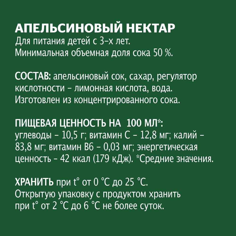 Нектар Добрый Апельсиновый изготавливается из концентрированного сока, на основе натуральных ингредиентов, без использования консервантов, искусственных красителей и ароматизаторов. Подходит для питания детей с 3 лет. Напиток насыщенного оранжевого цвета обладает отличными освежающими качествами. Рекомендуется пить сок охлажденным. Продукт станет не только отличным средством для утоления жажды в жаркую погоду, но и хорошей основой для приготовления желе, молочно-фруктовых муссов и коктейлей.