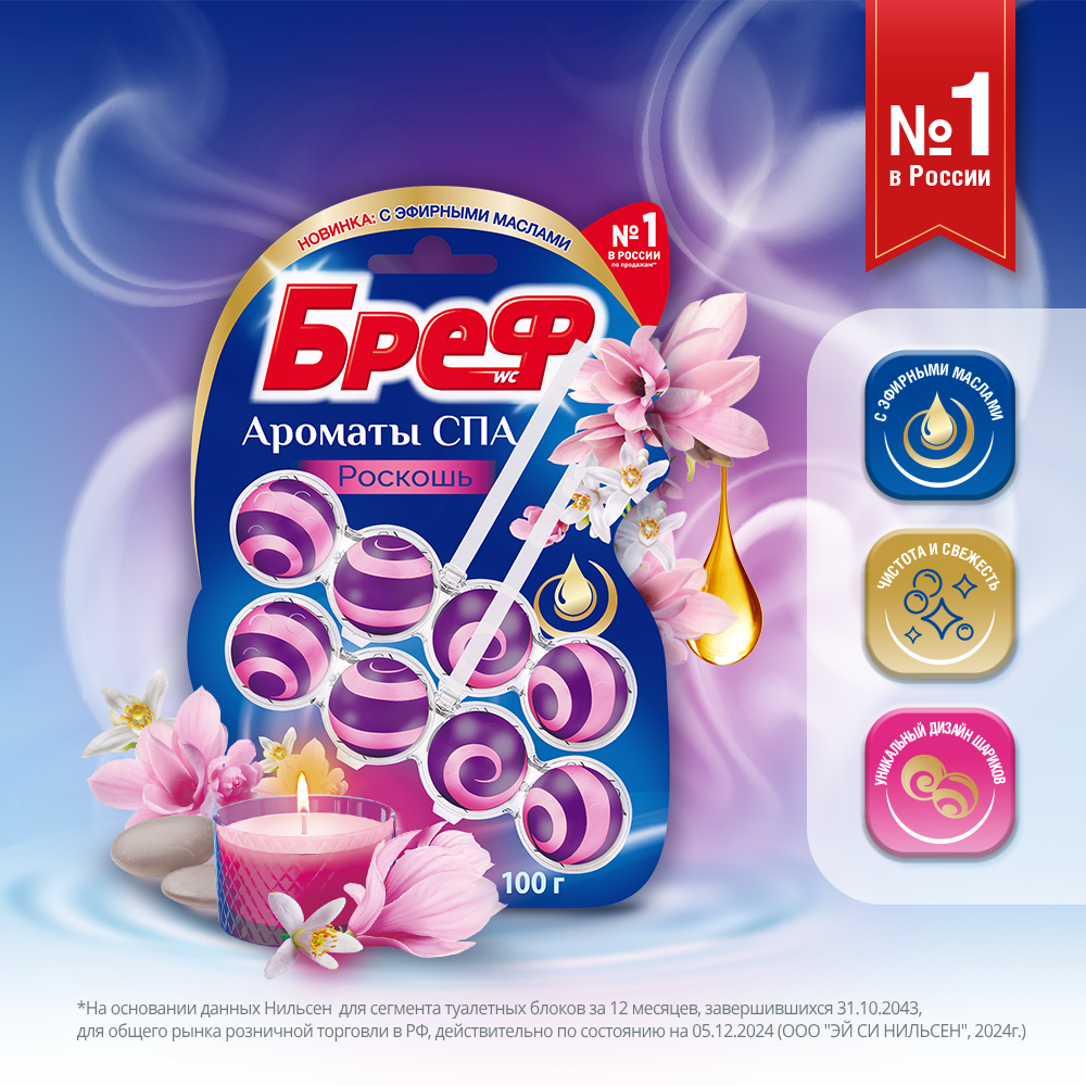 Новая линейка Бреф Ароматы СПА создаёт неповторимую атмосферу в вашей туалетной комнате благодаря изысканным ароматам с добавлением эфирных масел. Туалетный блок Бреф Ароматы СПА действует в 4 направлениях: образует очищающую пену, которая обеспечивает гигиеническую чистоту, предотвращает образование известкового налета, помогает предотвратить повторное загрязнение, придает туалетной комнате изысканный аромат после каждого смывания.