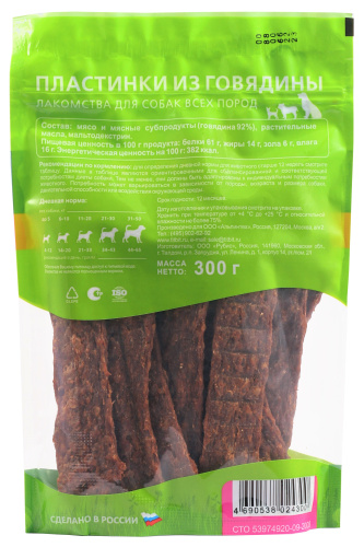 Лакомства для собак благодаря бережному приготовлению имеют привлекательный внешний вид и вкус. Мясо и мясные субпродукты, входящие в основу пластинок, являются превосходным источником высококачественного животного белка, витаминов и минералов. Это полезное и натуральное угощение, ни один гурман не сможет устоять перед таким деликатесом. Говядина входящая в состав лакомства является источником Fe(железо). Большая XXL упаковка с zip-lock застежкой, позволит надолго сохранить вкус и аромат лакомства.