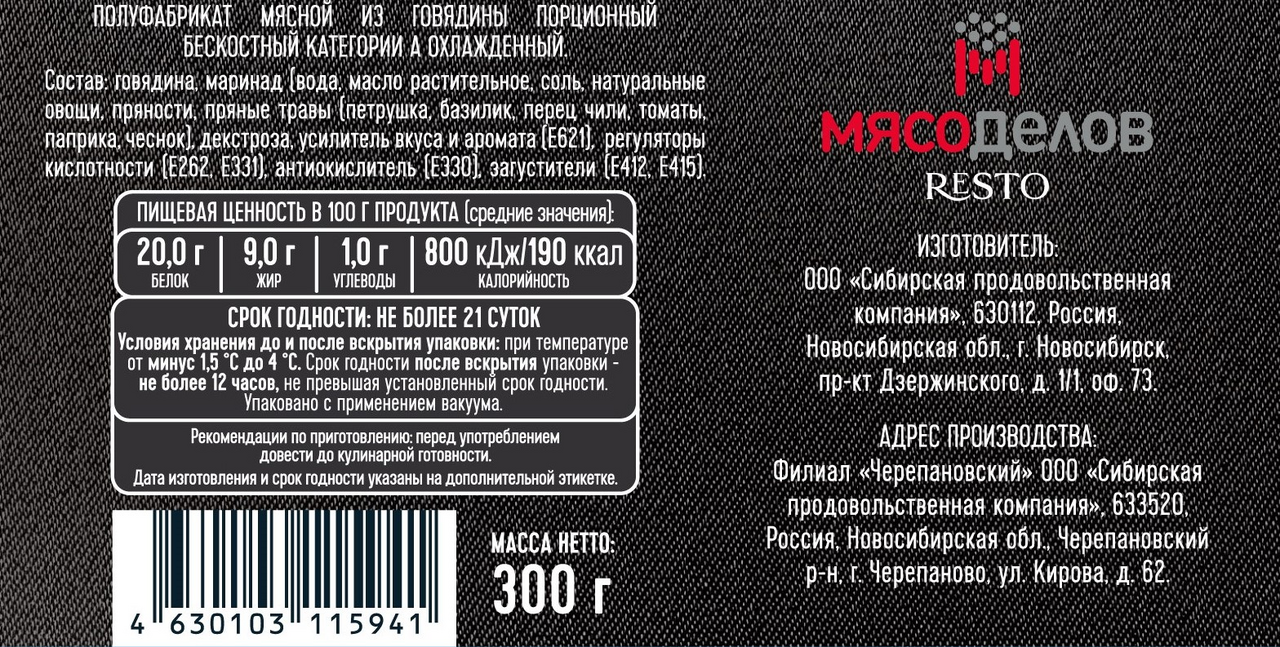 Стейк из говядины Мясоделов в маринаде охлажденный, 300г