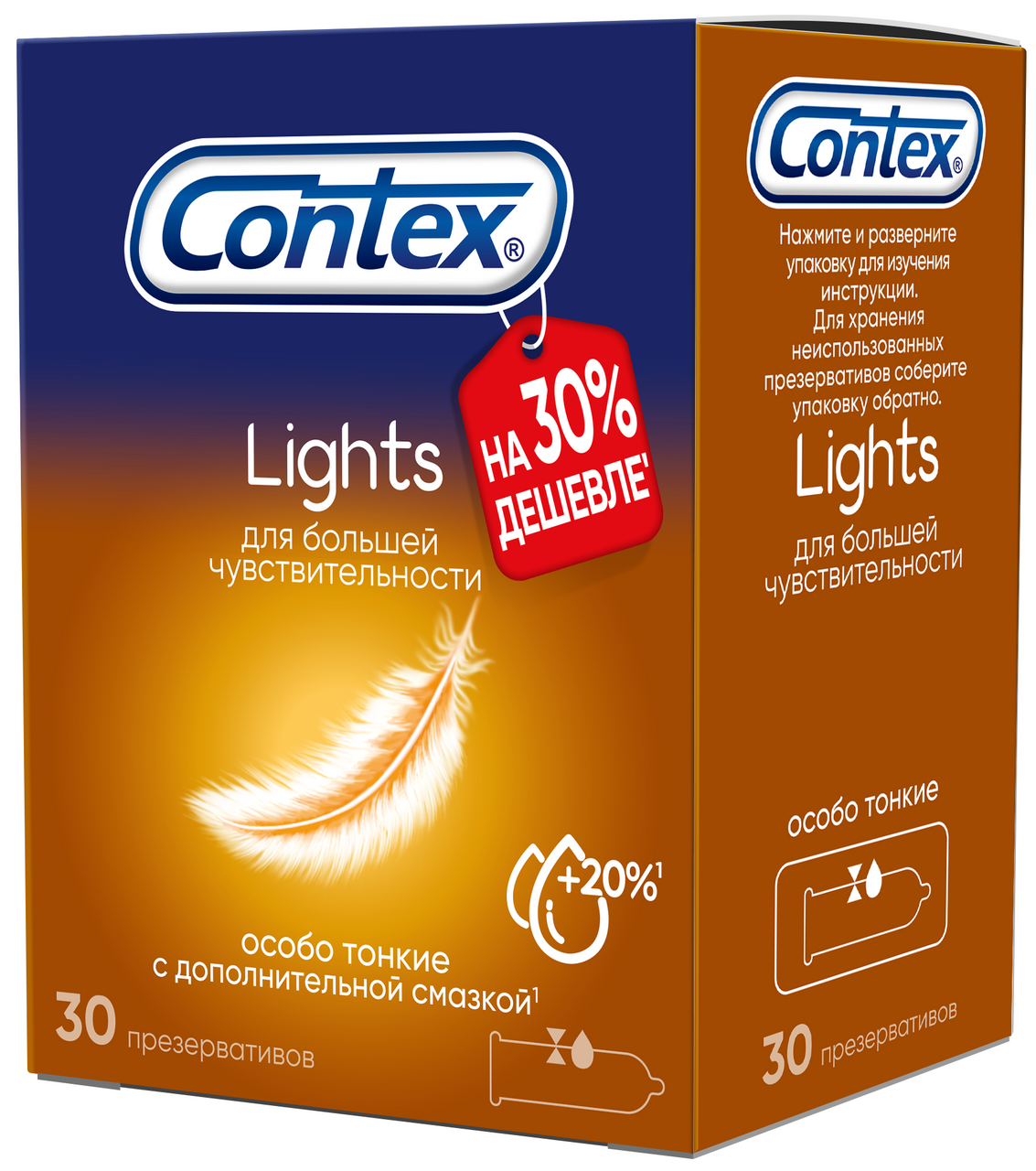 Презервативы СContex Lights - гладкие, тонкие. 30 особо тонких презервативов Contex Lights (Лайтс) в силиконовой смазке для большей чувствительности. Бесцветные, прямой формы, с накопителем. Номинальные размеры: длина 180мм, ширина 52мм. Смазка не разрушает сперматозоиды. Изготовлены из натурального латекса. Проверено электроникой. Только для одноразового использования. Презервативы являются средством предотвращения нежелательной беременности и профилактики заболеваний, передающихся половым путем (ЗППП), в том числе ВИЧ-инфекции.