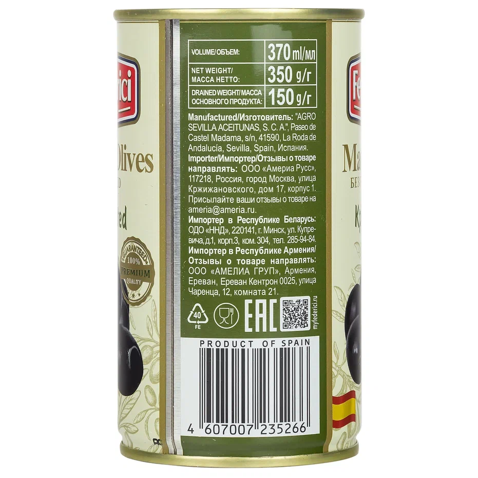 Молодые ягоды оливкового дерева тщательно отбираются по цвету и размеру, чтобы украсить ваш стол. Кроме того, это незаменимый источник полиненасыщенных жирных кислот и антиоксидантов. Плоды оливкового дерева содержат клетчатку, витамины группы В, А, Е, минеральные элементы, незаменимые аминокислоты, линоленовую и олеиновую кислоты. Употребление маслин налаживает желудочную перистальтику, восстанавливают кишечную микрофлору и улучшают переваривание пищи. Также они полезны для сердечно-сосудистой системы. Маслины Federici можно употреблять как готовое блюдо или добавлять в состав супов, пицц, в салаты, коктейли.
