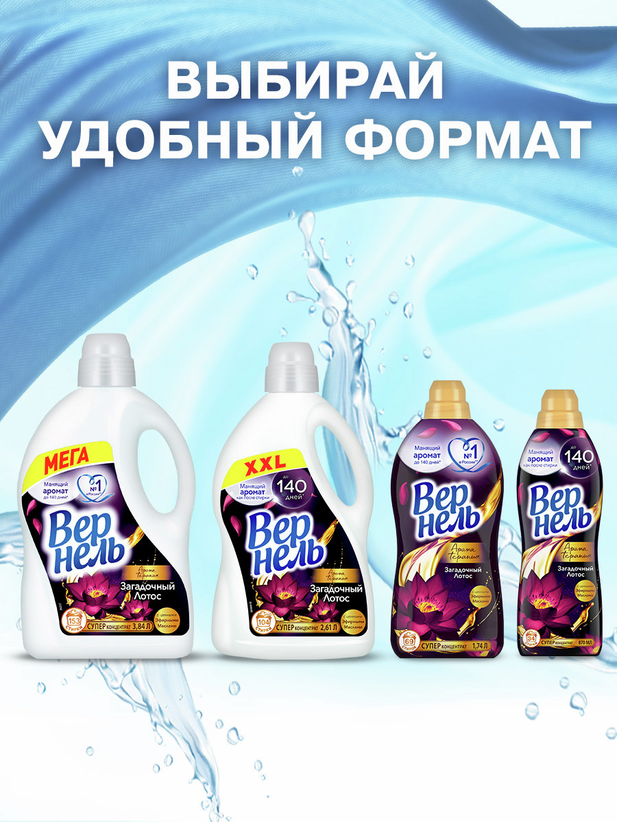 Подарит Вашему белью не только невероятную мягкость, но и магический аромат лотоса. Благодаря специальным аромакапсулам оригинальный кондиционер для стирки Вернель позволит наслаждаться интенсивным ароматом до 140 дней. Парфюмированный кондиционер подходит для всех видов тканей. Избегайте непосредственного контакта средства для стирки с тканью.