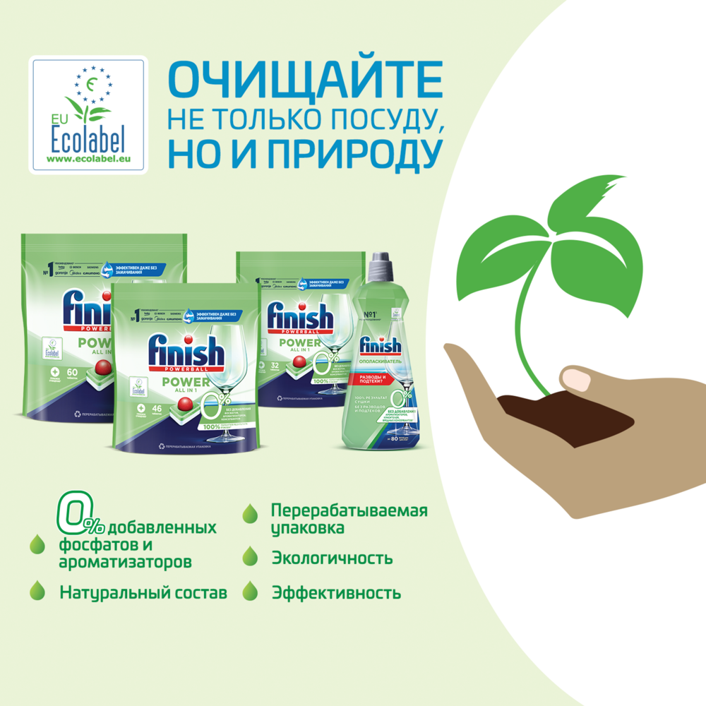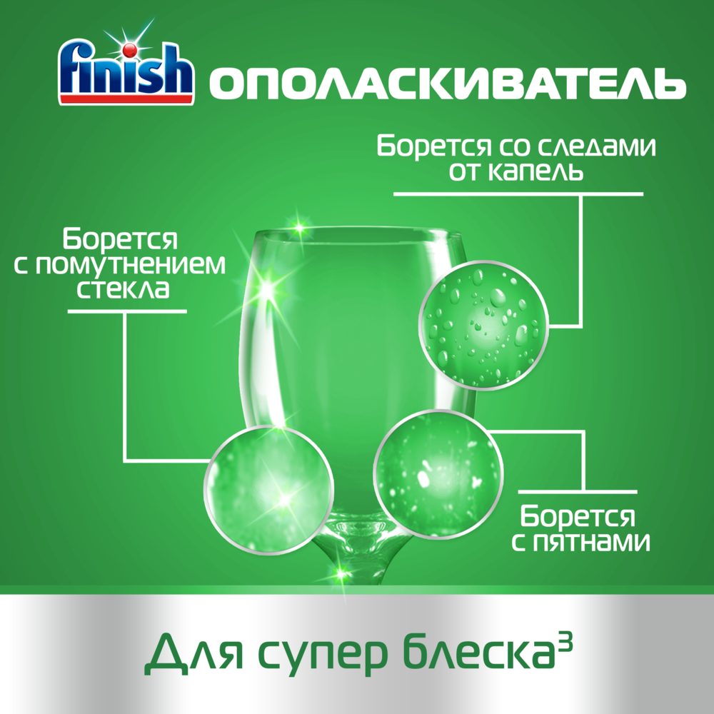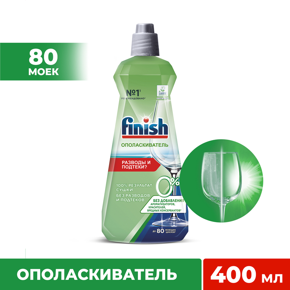 Ополаскиватель для посудомоечных машин Finish 0%, 400мл — это удобное в использовании средство для посудомоечной машины без фосфатов, ароматизатора и консервантов, не имеющее ярко выраженного запаха. Придает посуде блеск, борется с подтеками, ускоряет процесс сушки, борется со следами от капель. Экологичность подтверждена международным эко-сертификатом.