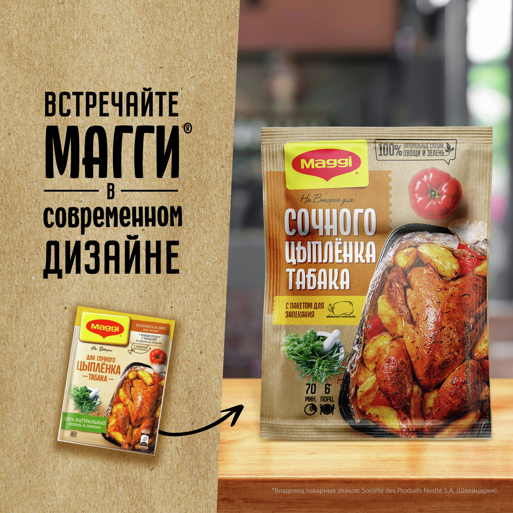 Maggi На второе для Сочного Цыпленка Табака поможет легко и быстро приготовить вкусное блюдо грузинской кухни! Запеченная целиком в специальном пакете без дополнительного добавления масла курочка получается необычайно сочной, вкусной и с хрустящей корочкой. А комбинация овощей и ароматных трав и специй восточной кухни поможет раскрыть вкус и аромат вашего блюда. В новом большом пакете для запекания вы можете готовить любимого цыпленка табака сразу с гарниром - свежими овощами по сезону или крупами, и каждый раз за 60 минут создавать сбалансированное и вкусное блюдо. Новый вариант приготовления цыпленка с овощами и соусом.