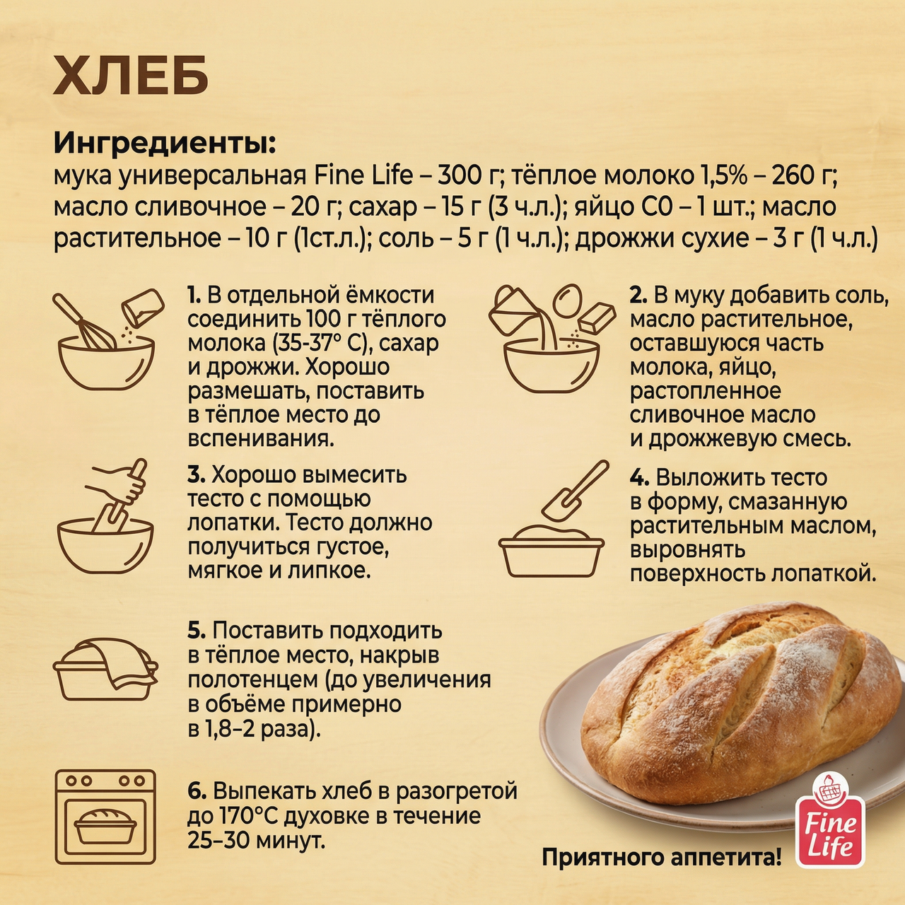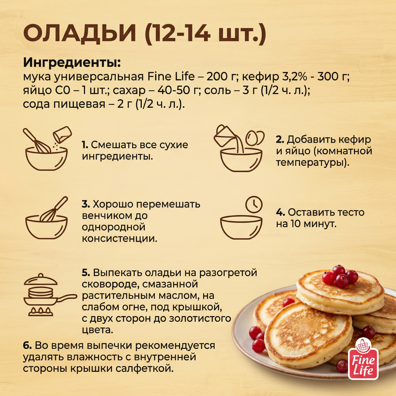 Универсальная мука без глютена Fine Life для приготовления любого вида выпечки: хлеба, пирогов, тортов и кексов, блинов и оладий, печенья, пельменей и вареников, вафель и галет. Продукт предназначен для всей семьи, не содержит глютен. Отсутствие глютена проверяется на каждом этапе производства.