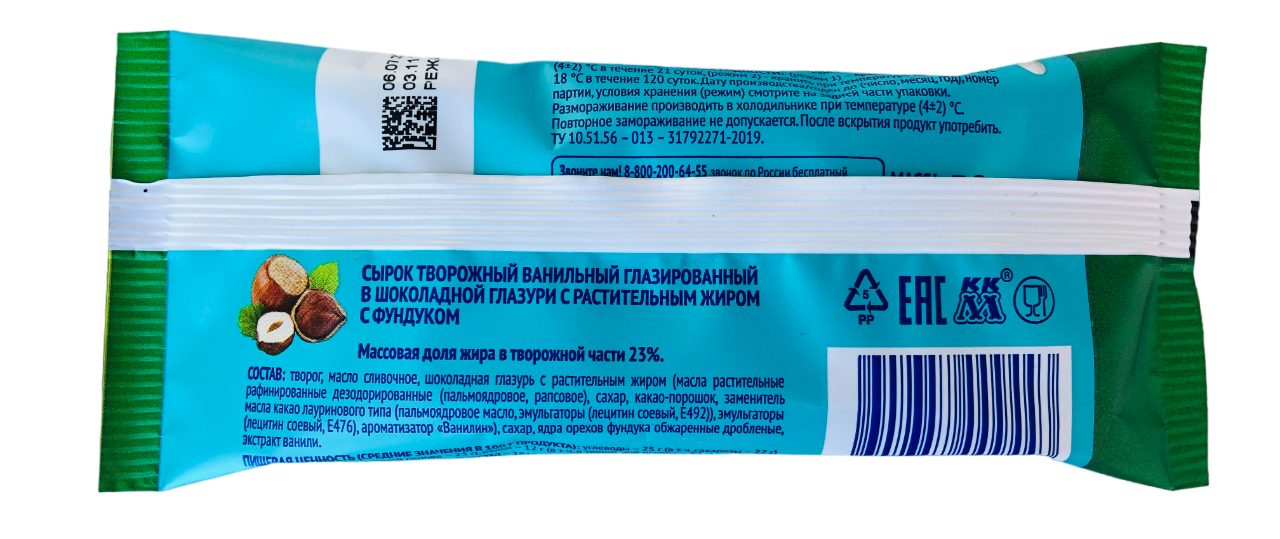Творог, масло сливочное, молочная шоколадная глазурь с растительным жиром с фундуком (молочная шоколадная глазурь (сахар, масло какао, какао тертое, обезвоженный молочный жир, сухое цельное молоко, сухая молочная сыворотка, растительный жир (эквивалент масла какао), эмульгатор соевый лецитин, эмульгатор Е476, ароматизатор ванилин идентичный натуральному), кокосовое масло, ядра орехов фундука обжаренные дробленые), сахар, экстракт ванили.