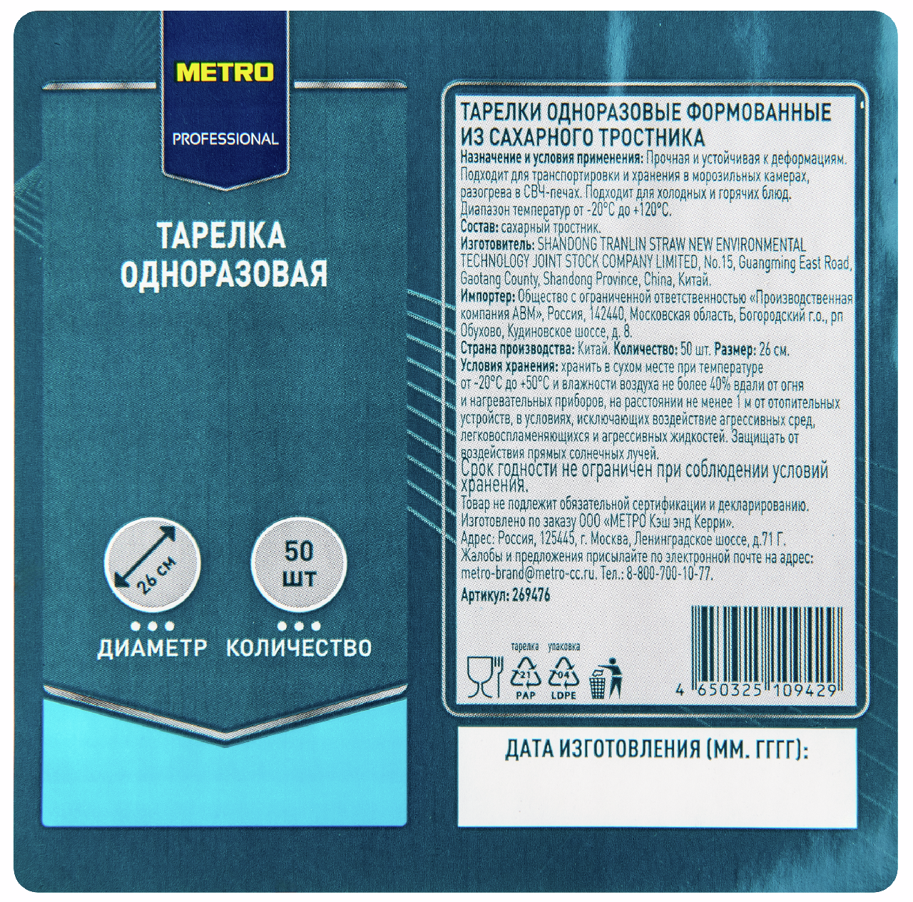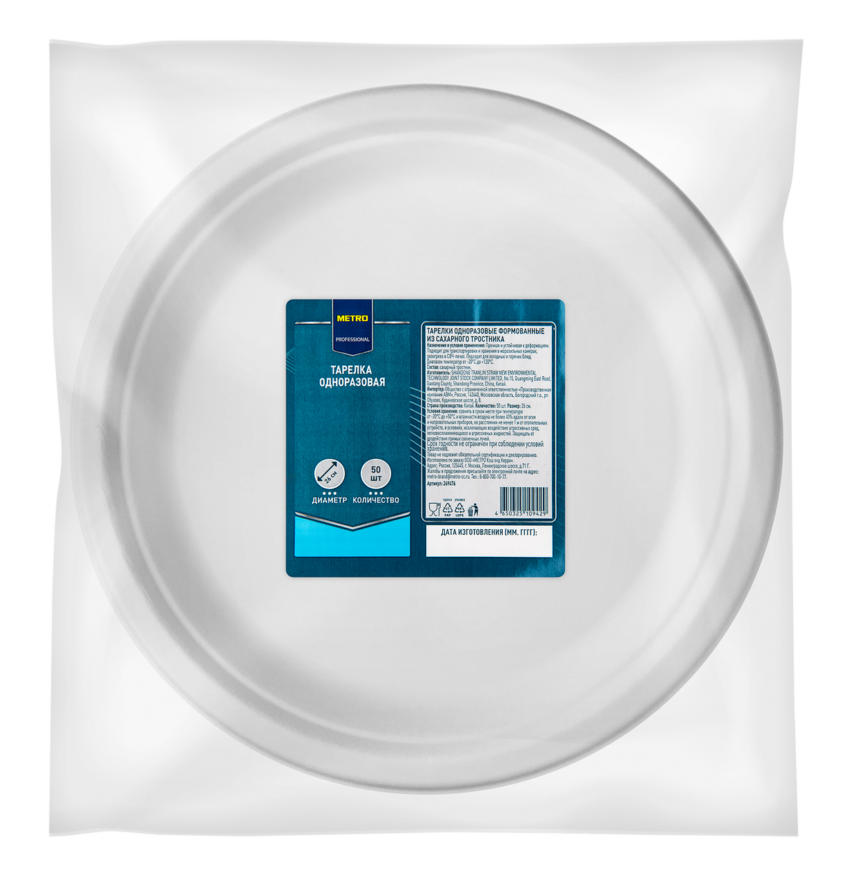 METRO PROFESSIONAL Тарелка из сахарного пластика 26см, 50шт - альтернатива тарелкам из пластика. Материал похож на бумагу, приятный на ощупь. Диапазон рабочих температур позволяет использовать в морозильной камере и при разогреве в микроволновой печи. Легкая, прочная, устойчивая к деформации. Обладает высокой влагонепроницаемостью. Пропускает воздух. Безопасна для природы и человека. При производстве и утилизации не выделяются вредные соединения и парниковые газы. Не выделяет канцерогенов при соприкосновении с пищей и попадании в окружающую среду. Продукты в такой посуде могут хранится более длительное время по сравнению с аналогами. Может быть использована в качестве компоста на даче. Изготовлена из экологически чистого материала, не содержит вредных веществ и легко утилизируется. Белый цвет добавляет элегантности и универсальности. В упаковке содержится 50 штук, что обеспечивает достаточное количество для большой компании. Идеальный выбор для сервировки стола на пикниках, вечеринках или в дороге. Тарелка идеально подходит для холодных и горячих блюд, её можно использовать при температуре от -20 до +100 градусов. Благодаря своей прочности и лёгкости она станет незаменимым помощником на природе и дома.