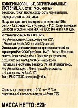 Перец красный сладкий, баклажан, яблочный уксус, масло подсолнечное, чеснок, соль, сахар.
