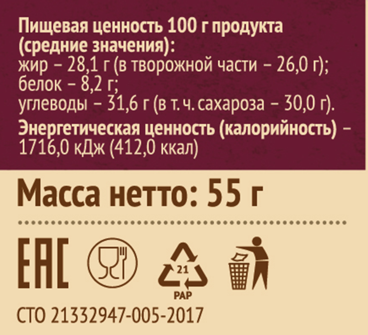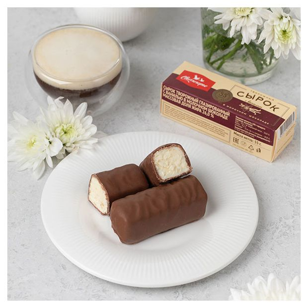 Творог (молоко цельное, молоко восстановленное из сухого молока, масло сливочное, закваска, молокосвёртывающий ферментный препарат), сахар, молочный шоколад (сахар, масло какао, сухое цельное молоко, какао тертое, эмульгатор: соевый лецитин, натуральный ароматизатор: ваниль), сливочное масло, экстракт ванили.