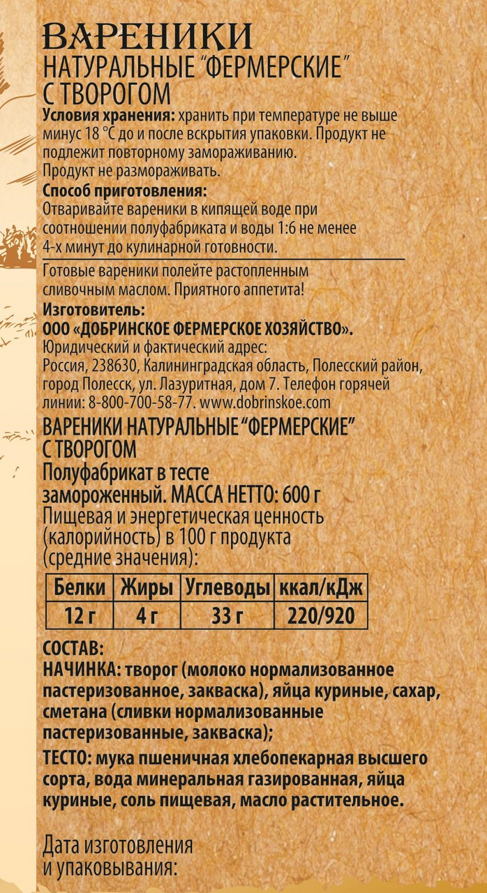 Вареники Добринское Фх фермерские с творогом замороженные, 600г