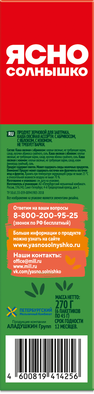 Каша овсяная Ясно солнышко абрикос-яблоко-изюм 45г x 6шт, 270г