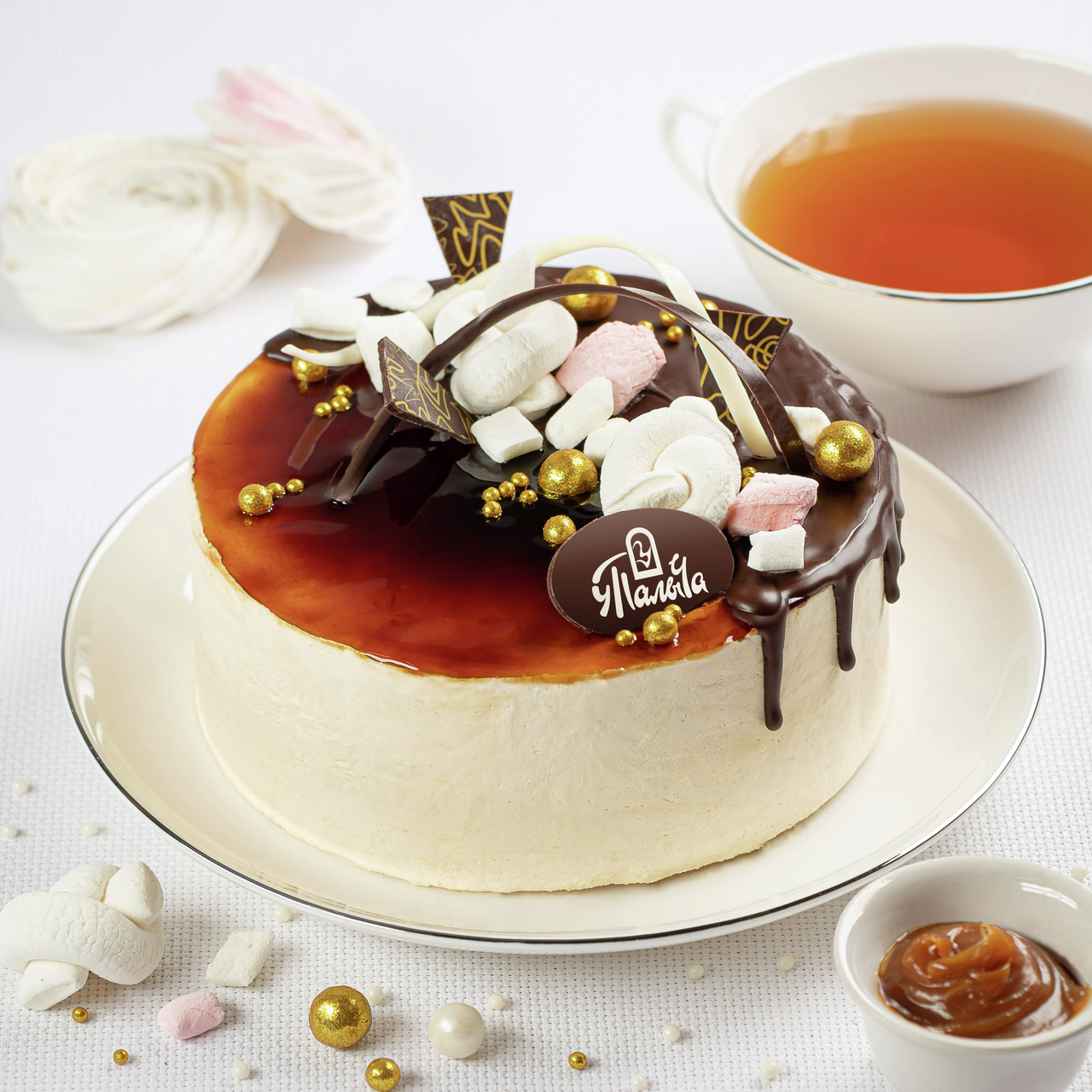 Нежный, воздушный бисквит на основе муки высшего сорта с добавлением сгущенного молока и карамельный мусс на основе творожного сыра, сливок, соленой карамели. Десерт декорирован шоколадной и карамельной глазурью, маршмеллоу и воздушным цветным рисом. Нежный карамельный мусс в тандеме с бархатным бисквитом очарует не только взрослых, но и маленьких сладкоежек. Он идеально подойдет к чашечке чая или кофе.