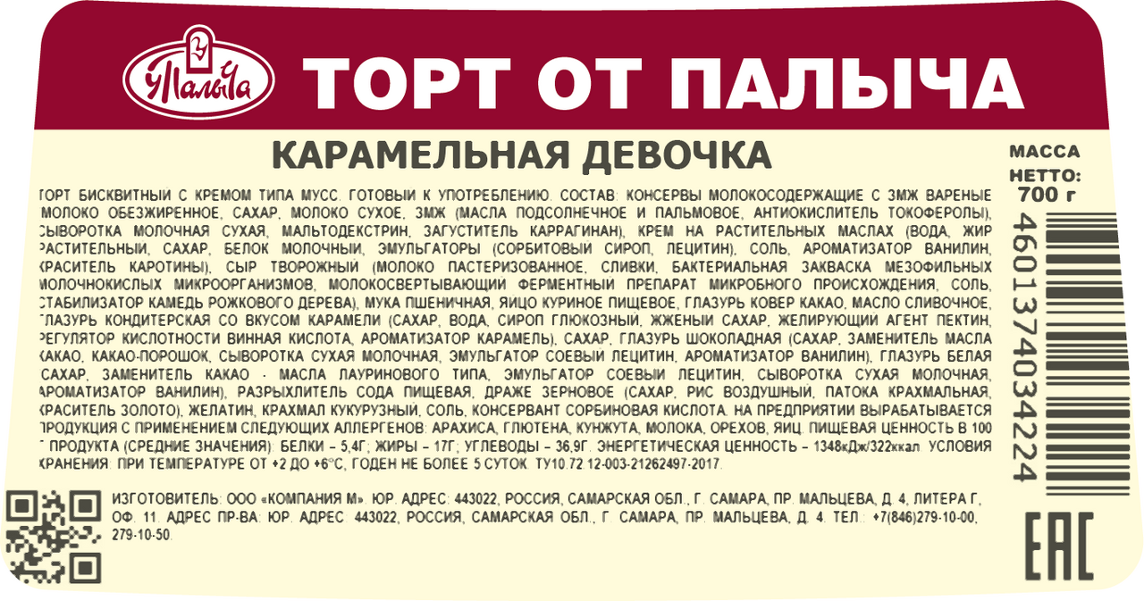 Консервы молокосодержащие с заменителем жира вареные (молоко обезжиренное, сахар, молоко сухое цельное, заменитель жира (масла подсолнечное и пальмовое, антиокислитель токоферолы), сыворотка молочная сухая, мальтодекстрин, загуститель каррагинан, консервант сорбат калия), крем на растительных маслах (вода, жир растительный, сахар, белок молочный, эмульгаторы (сорбитовый сироп, лецитин), соль, ароматизатор ванилин, краситель каротины), сыр творожный (молоко пастеризованное, сливки, бактериальная закваска мезофильных молочнокислых микроорганизмов, молокосвертывающий ферментный препарат микробного происхождения, соль, стабилизатор камедь рожкового дерева), мука пшеничная, яйцо куриное пищевое, глазурь Ковер какао, масло сливочное, глазурь кондитерская со вкусом карамели, сахар, глазурь шоколадная, глазурь белая, разрыхлитель сода пищевая, драже зерновое (сахар, рис воздушный, патока крахмальная, краситель золото), желатин, крахмал кукурузный, соль, консервант сорбиновая кислота.