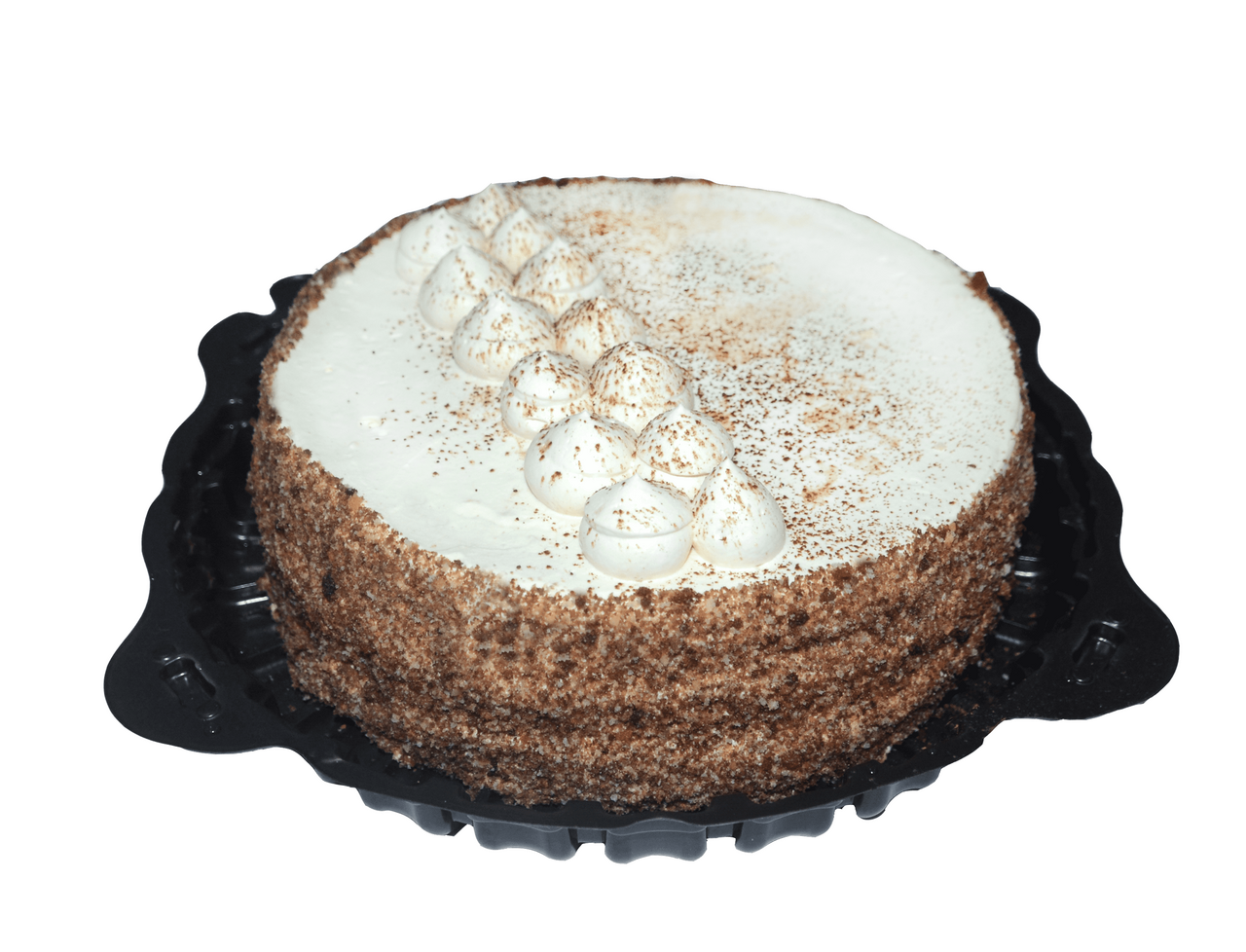 Бисквитные коржи, пропитанные коньячным сиропом с кофи и суфле Тирамису с прослойкой из шоколадной крупки, отделан кремом из взбитых сливок с кофейным вкусом, шоколадной посыпкой и декором в виде кофейных зерен, поверхность декорирована какао-порошком.