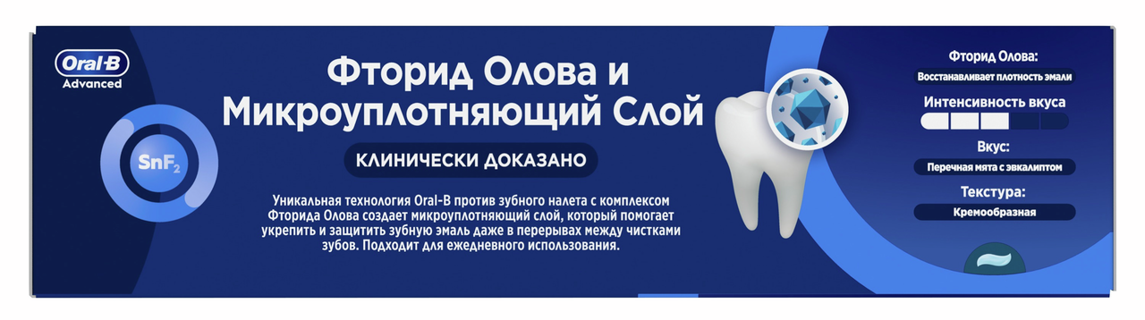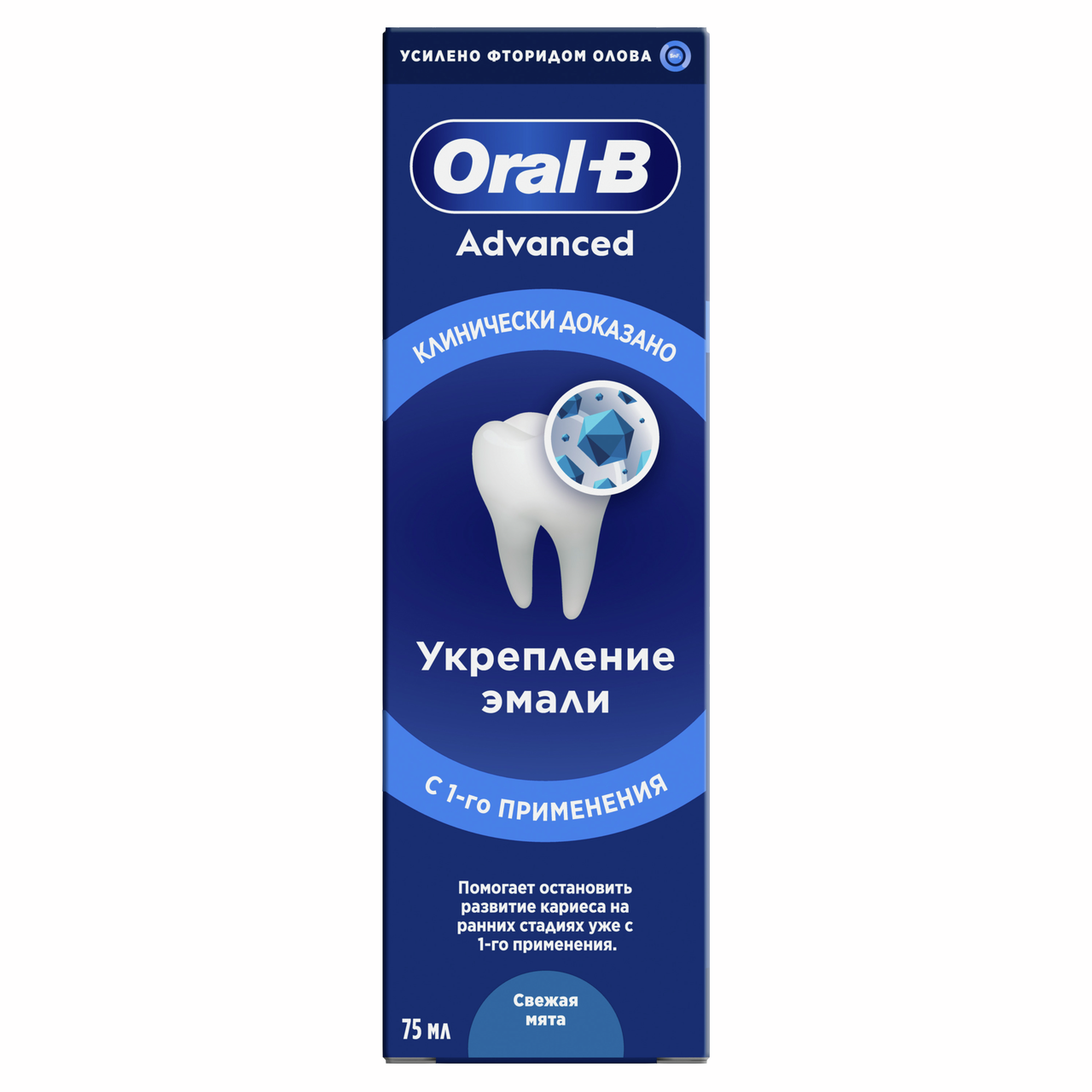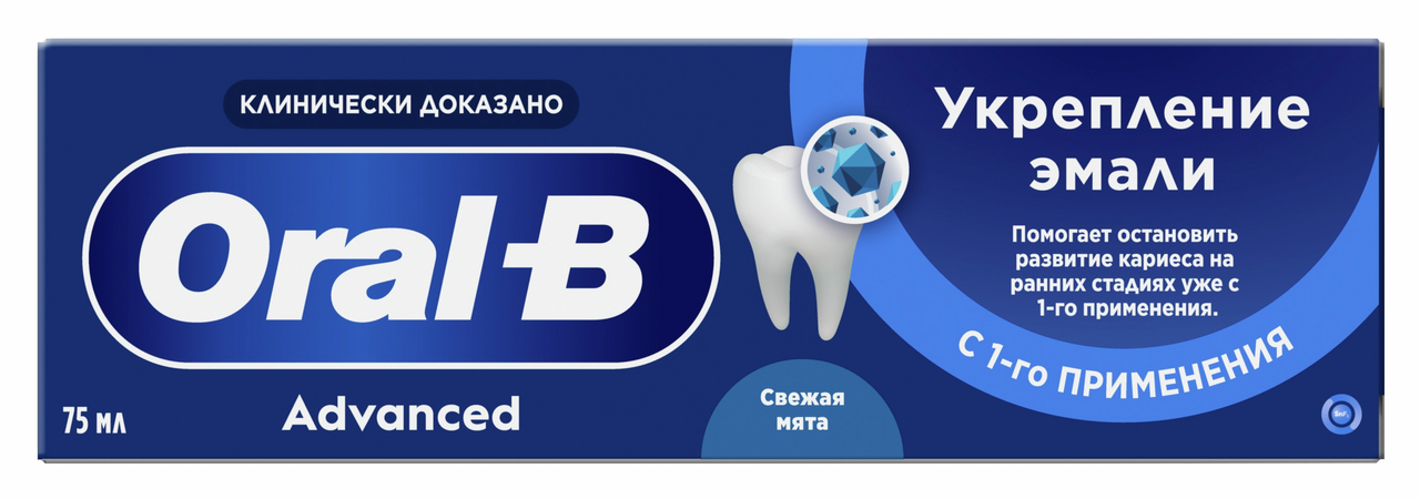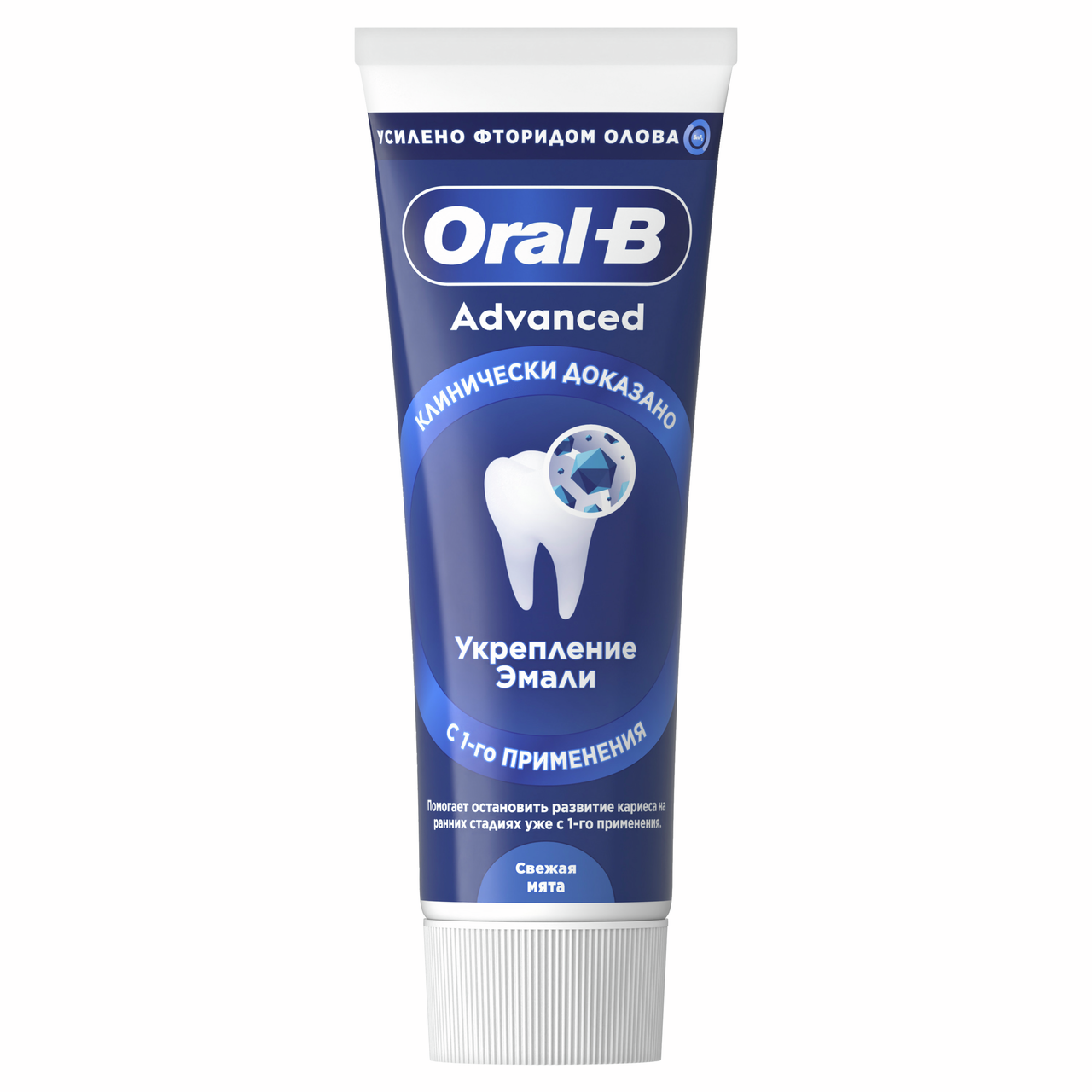 Зубная паста Oral-B Advanced Укрепление эмали Свежая мята помогает остановить кариес на ранней стадии, начиная с первого использования. Клинически доказано. Уникальная антибактериальная технология с комплексом Фторида Олова создает микроуплотняющий защитный слой, защищающий от потери минералов даже между чистками зубов и активно восстанавливающий плотность зубов.