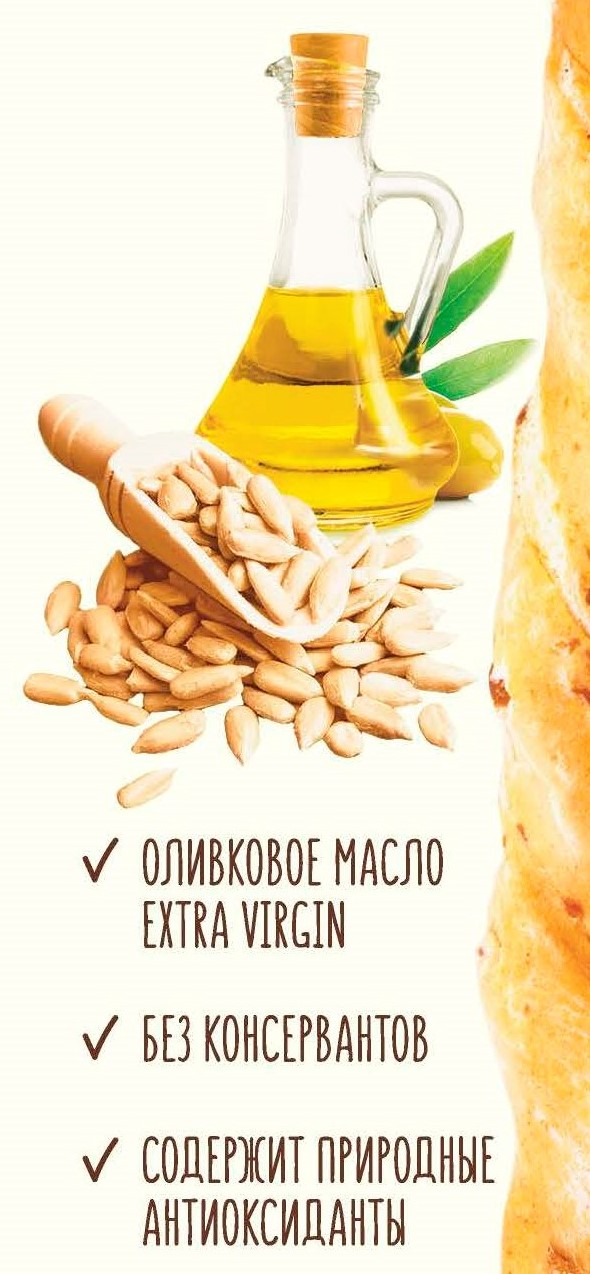 Мука пшеничная в/с, вода, семена подсолнечника, масло оливковое нерафинированное Extra Virgin, семена кунжута, соль морская, дрожжи хлебопекарные, глюкоза.
