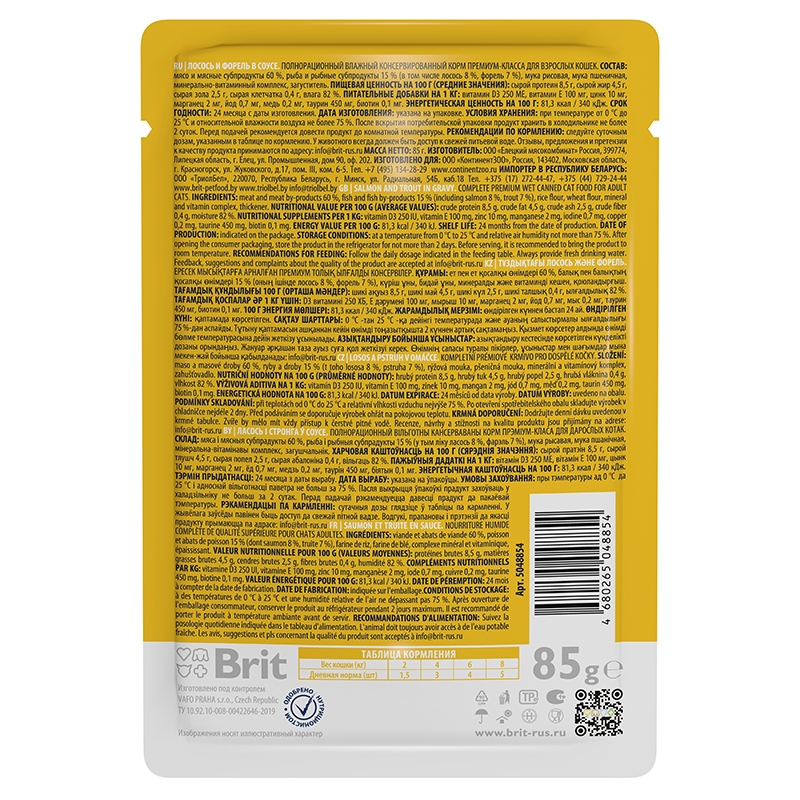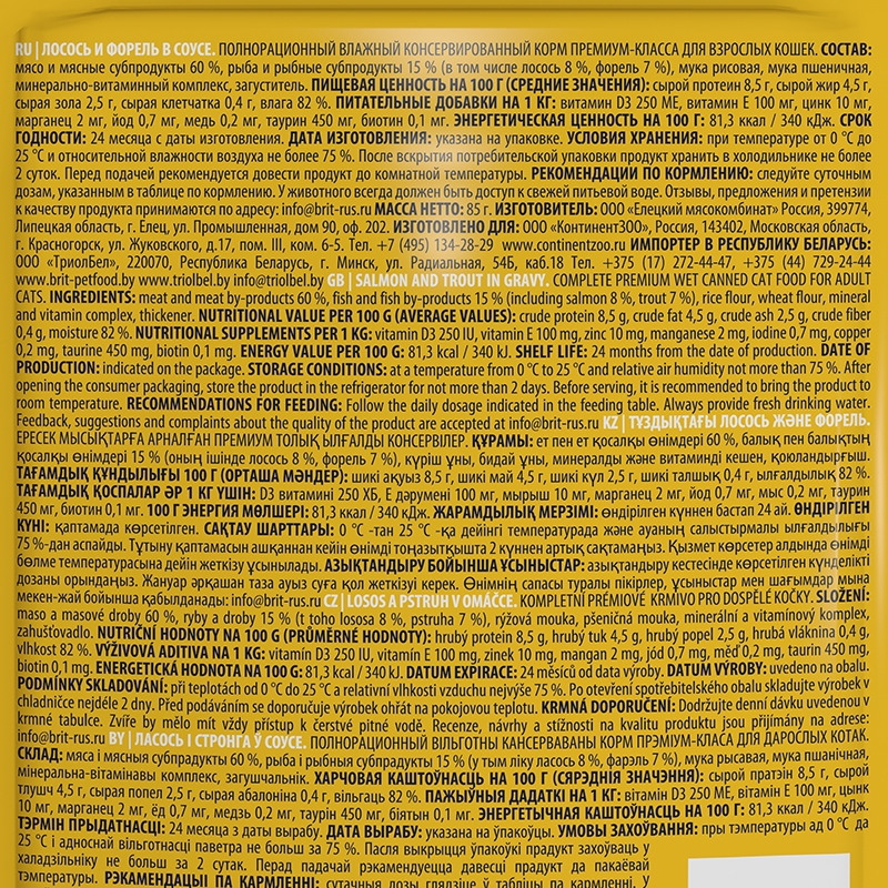 BRIT Лосось и форель – полнорационный влажный консервированный корм премиум-класса для взрослых кошек. Содержит комплекс витаминов и минералов для укрепления иммунитета и красоты шерсти. Нежные кусочки мяса в соусе понравятся всем привередам без исключения, даже вне зависимости от их породы.